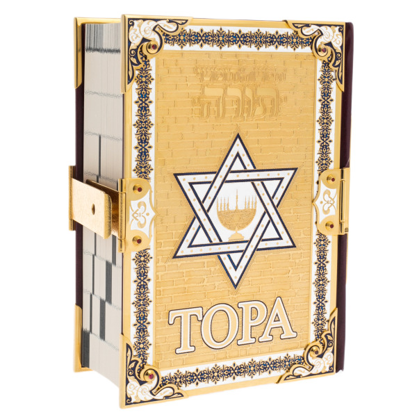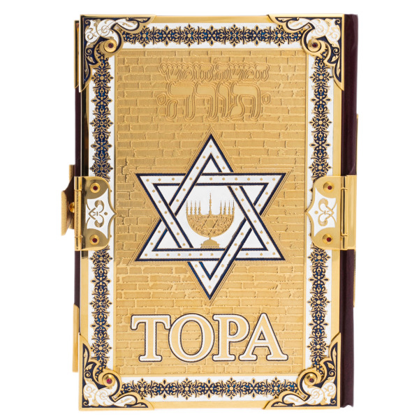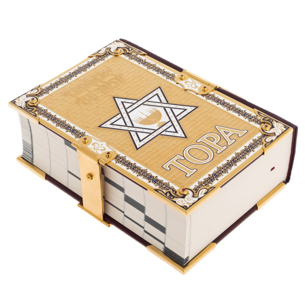 ТОРА Пятикнижие и Гафтарот с филигранью, топазами, серебромТОРА Пятикнижие и Гафтарот с филигранью, топазами, серебромСтильно оформленное подарочное издание в кожаном переплете. За время своего существования человечество создало несметное количество законов, но немногие из них по долголетию и масштабности своего воздействия сознание человека могут сравниться с законами Пятикнижия, особенно с Десятью Заповедями. Пятикнижие Моисеево, или Тора, - наиболее священный предмет иудаизма. По преданию, текст Торы был записан Моисеем со слов Всевышнего в течение сорока дней после дарования Торы на горе Синай. Пять первых книг канонической еврейской Библии, станут прекрасным подарком для любого последователя Иудаизма.