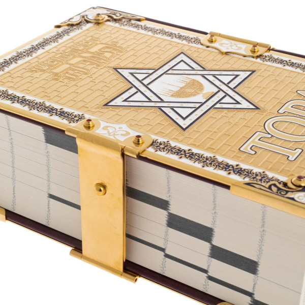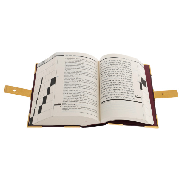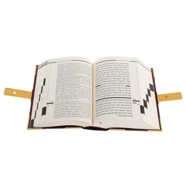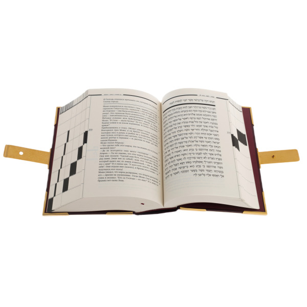 Крепкие позолоченные замки скрепляют книгу, охраняя её тайны от случайных рук. Они словно печати, запечатывающие заветные истины, доступные лишь тем, кто по-настоящему ценит их. Открывая книгу, взгляд падает на строки на священном иврите, каждая буква в которых выведена с безупречной точностью, словно выгравирована в вечности. Рядом — перевод и комментарии, позволяющие глубже проникнуть в смысл, понять заложенные в тексте пророчества и наставления.