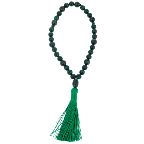 Изысканные четки, выполненные из малахита, прекрасно сочетаются с общим оформлением. Каждый шарик четок словно воплощает в себе звезды, через которые можно не только прикоснуться к святому тексту, но и ощутить всю глубокую связь с небесами. Шелковая кисть на конце четок добавляет им завершающего изящества, акцентируя внимание на важности духовной практики и молитвы.
