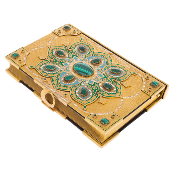 Этот эксклюзивный подарочный Коран, оформленный в уникальной обложке, не просто представляет собой священный текст, но является истинным произведением искусства, символизирующим благородство, мудрость и духовное величие. Золотистые узоры, тонкая работа мастеров на каждой детали обложки, создают впечатление сияния, будто сама природа вложила свою красоту в этот предмет. Малахитовые вставки, словно драгоценные камни, с их глубиной и насыщенностью цвета, придают книге особое значение, превращая ее в олицетворение силы и духа.