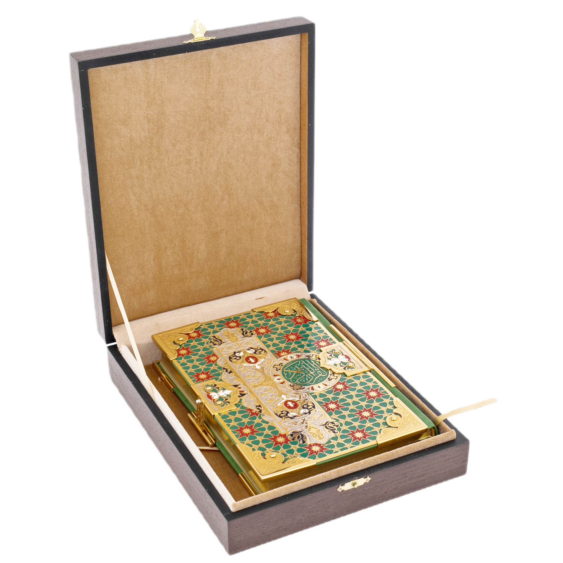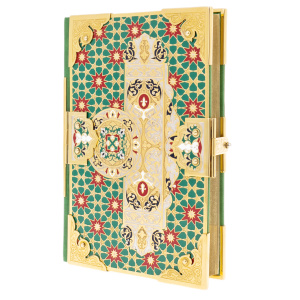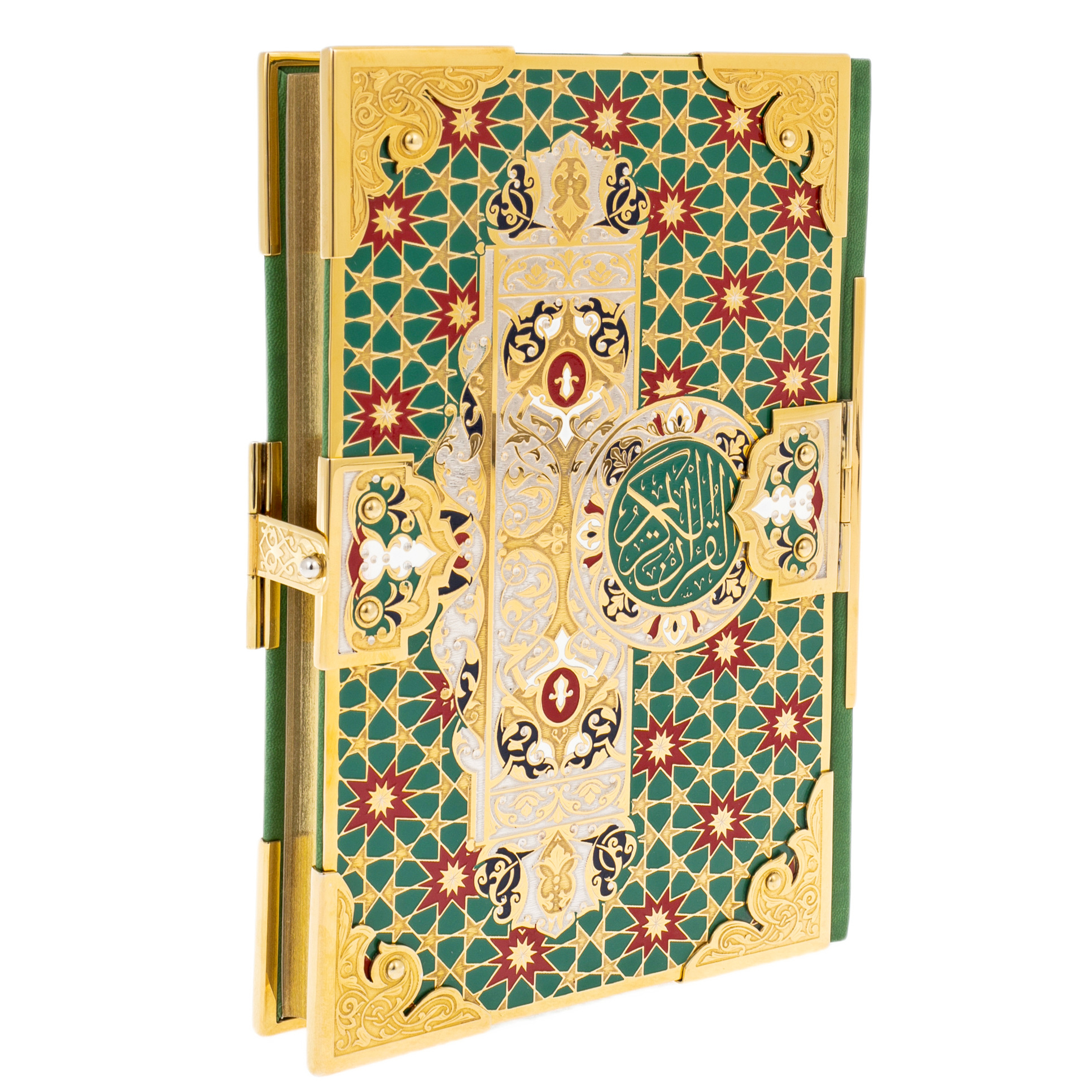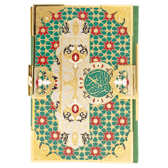Коран “Солнце Востока” — произведение, в котором соединены духовное содержание и высочайшее мастерство златоустовской гравюры. Это издание на арабском языке создано как драгоценная реликвия, достойная семейных собраний, дипломатических подношений и коллекций ценителей искусства. Твёрдая обложка, обтянутая зелёной кожей, заключена в металлический оклад, украшенный золочением, эмалями и сложным орнаментом. Центральная часть оформлена глубоким зелёным медальоном с каллиграфической надписью, обрамлённой изящными восточными узорами. Рельефная застёжка и угловые накладки завершают облик книги, придавая ей ощущение защищённости и священного покоя.