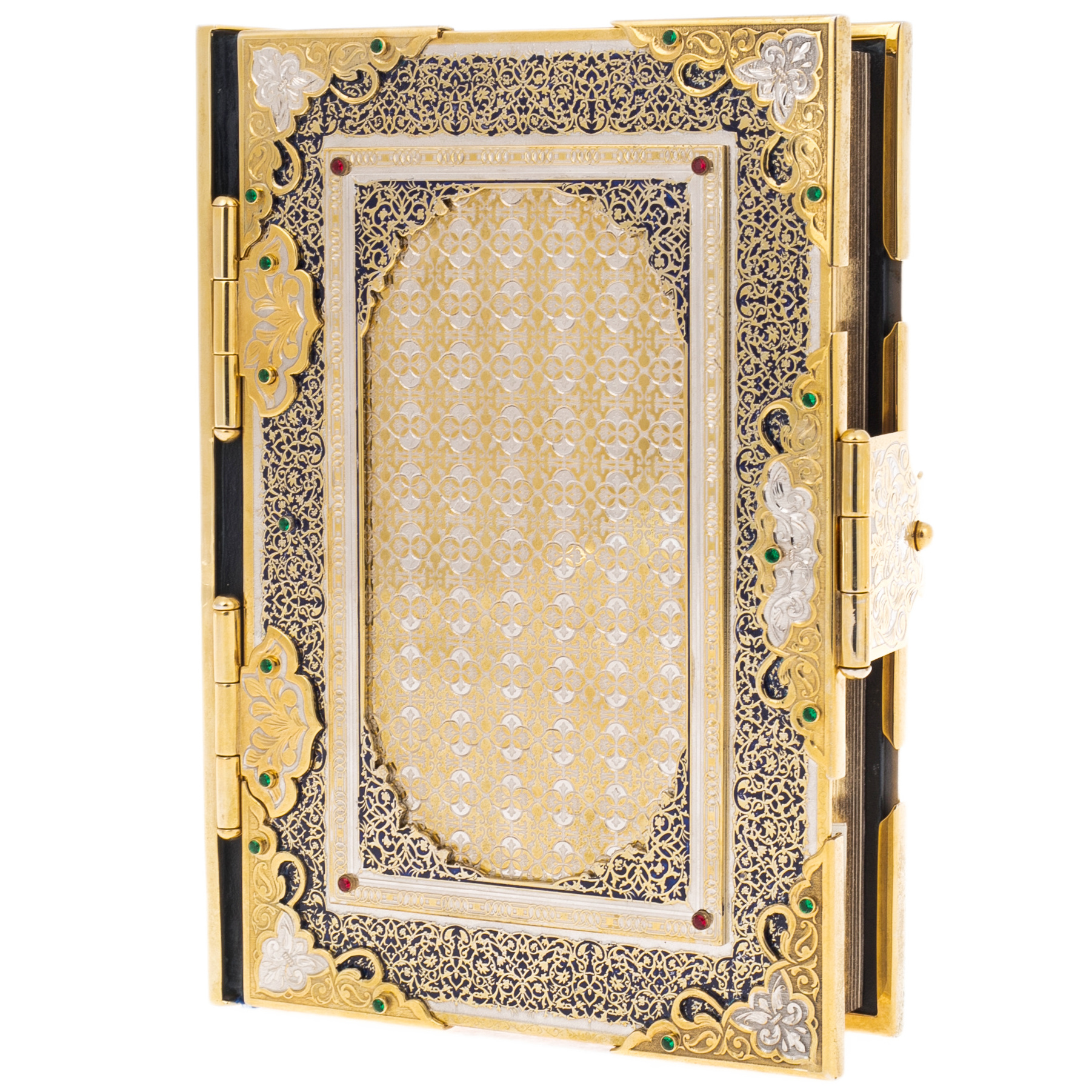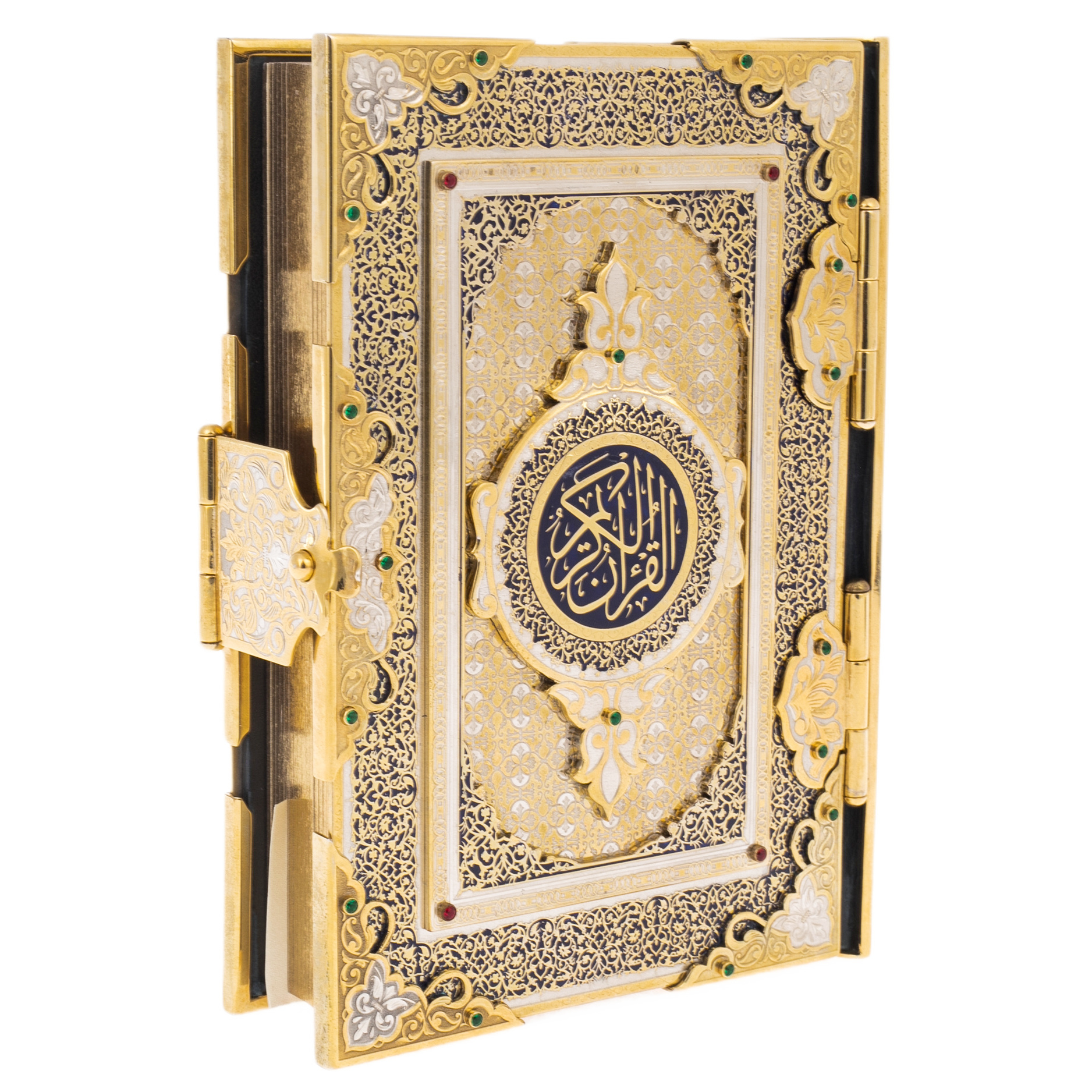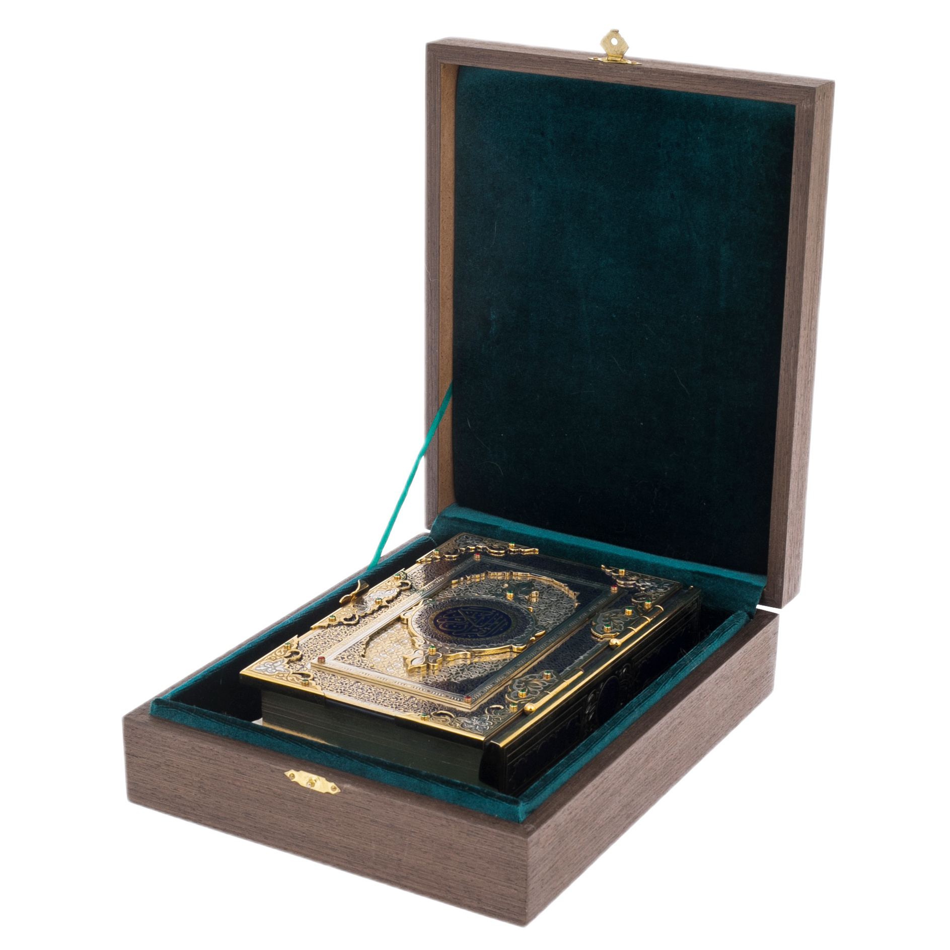 Священный Коран «Восток» — не просто книга, а сокровище, заключённое в художественный образ, достойный наследия династий и великих домов. Переплёт инкрустирован золочёными деталями, украшен ювелирными вставками и затянут в орнаментальные гравировки с восточной стилистикой. Застёжки из металла придают изделию особую завершённость. Издание вмещает канонический текст на арабском языке, отпечатанный на высококачественной бумаге с бережным колористическим оформлением. Формат книги и её вес внушают почтение, а каждая деталь исполнения подчёркивает сакральный статус предмета.