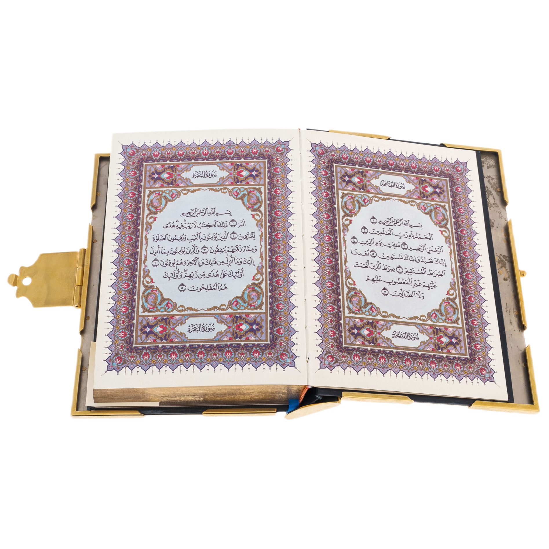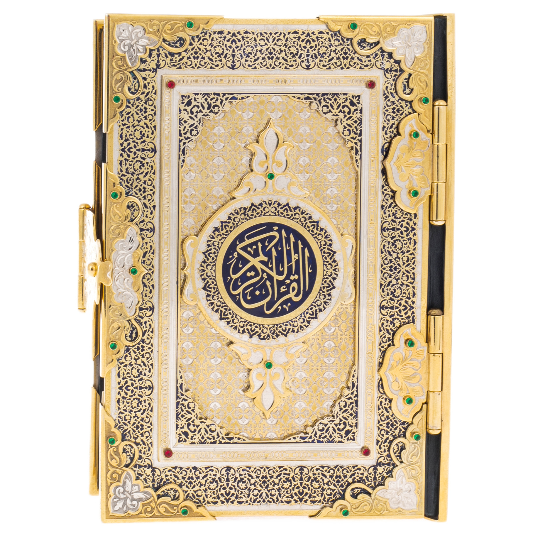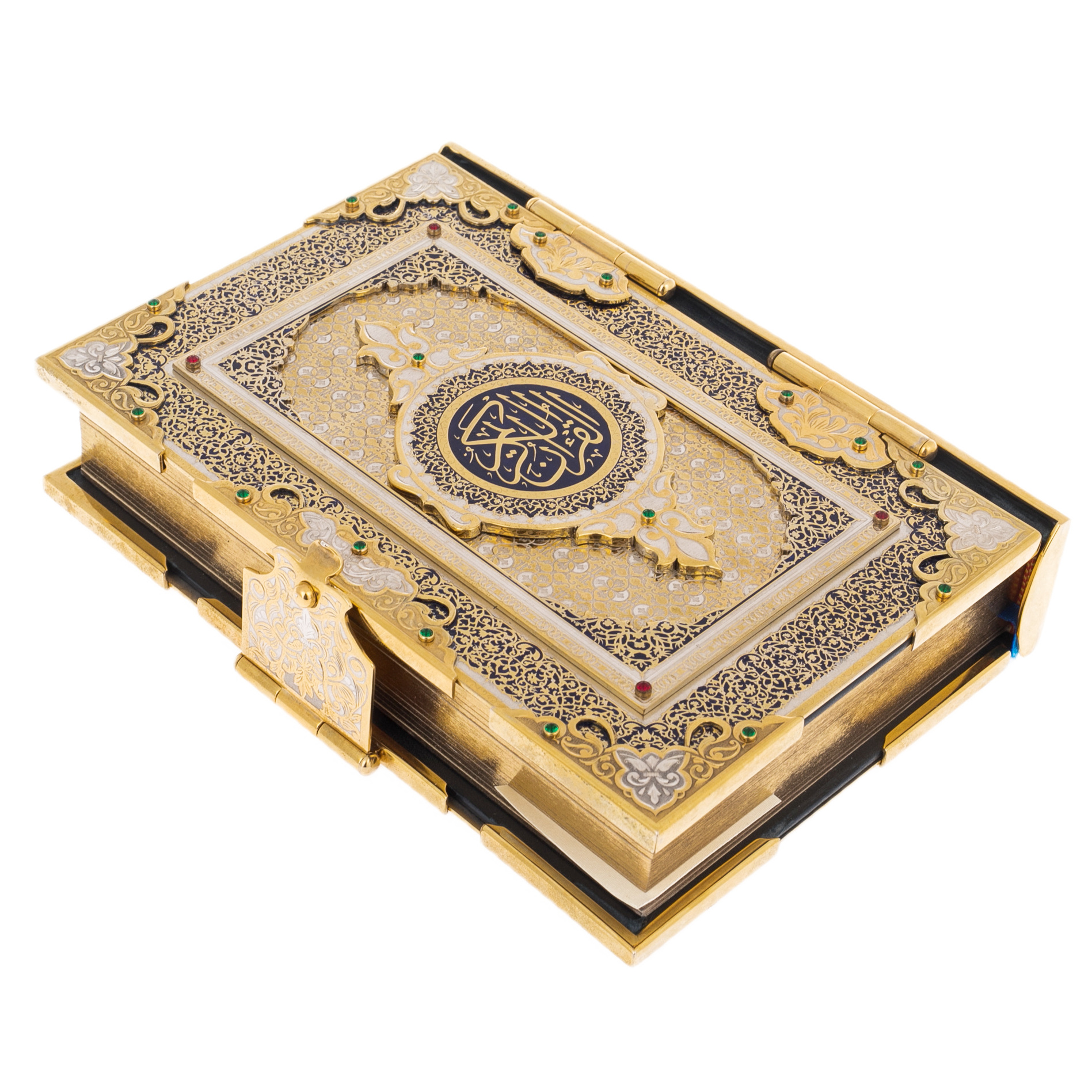 Священный Коран «Восток» — не просто книга, а сокровище, заключённое в художественный образ, достойный наследия династий и великих домов. Переплёт инкрустирован золочёными деталями, украшен ювелирными вставками и затянут в орнаментальные гравировки с восточной стилистикой. Застёжки из металла придают изделию особую завершённость. Издание вмещает канонический текст на арабском языке, отпечатанный на высококачественной бумаге с бережным колористическим оформлением. Формат книги и её вес внушают почтение, а каждая деталь исполнения подчёркивает сакральный статус предмета.