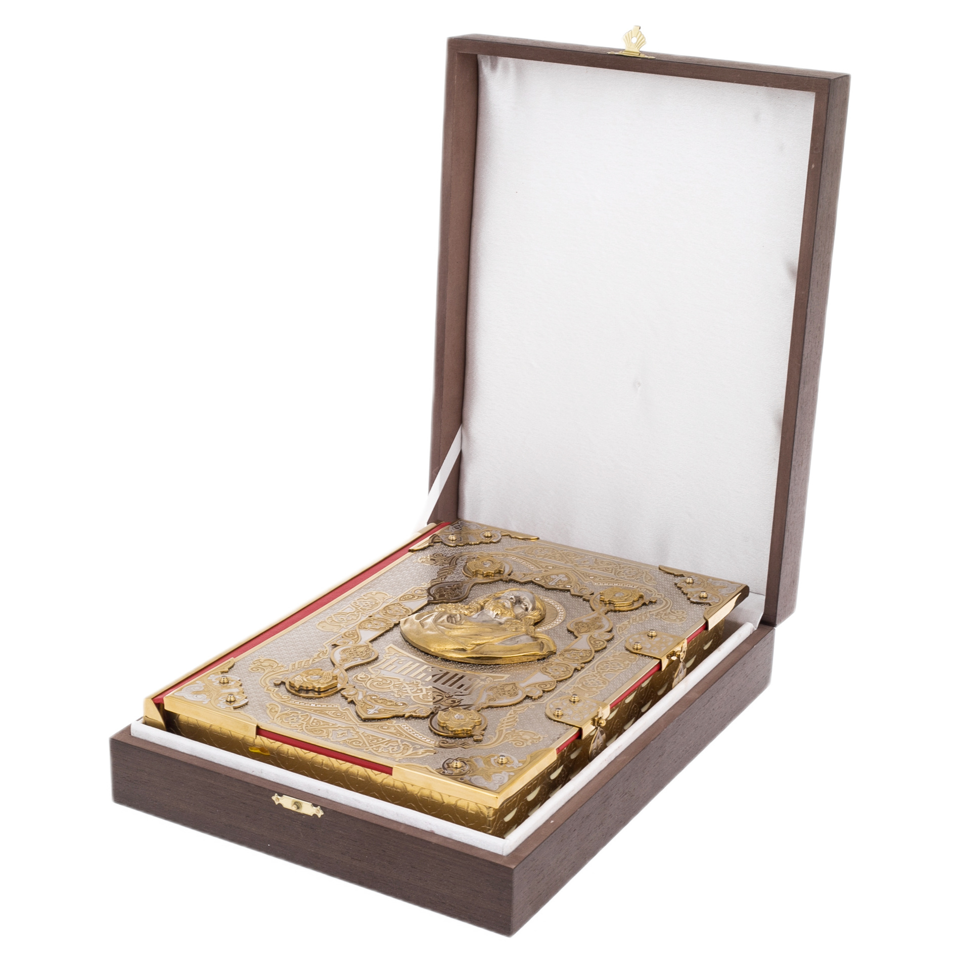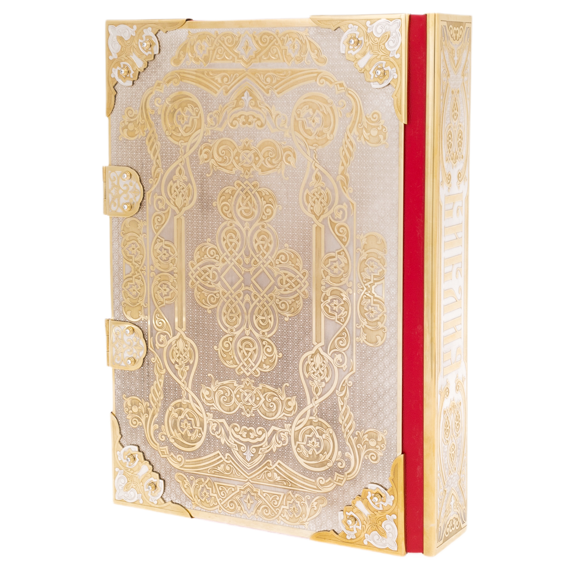 Резьба на обложке выполнена с невероятной точностью и тщательностью, каждая деталь продумана до мелочей, чтобы передать всю сложность и красоту древних орнаментов. Золотые и серебряные узоры переплетаются в сложные геометрические фигуры, образуя гармоничный рисунок, который привлекает взгляд и вызывает восхищение мастерством исполнителя.