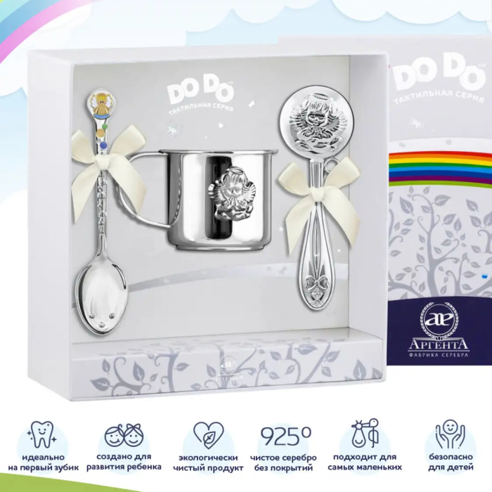 Тактильные развивашки DO DO - инновационный продукт, разработанный Фабрикой серебра «АргентА» совместно с ведущими специалистами в области логопедии, дефектологии и детской психологии. Тактильная серия DO DO одобрена педиатрами России и получила официальные заключения специалистов: она действительно способствует раннему развитию малышей. Приятный на ощупь специальный рельеф с выпуклыми элементами на черенке и яблочке ложки (и других изделиях) способствует развитию мелкой моторики малыша. Эти элементы легко массируют губы и язык ребёнка во время кормления или игры, развивают вкусовые рецепторы, мимические и артикуляционные мышцы, способствуют раннему развитию речи. Яркая цветная эмаль стимулирует эстетическое развитие ребёнка, а также привлекает внимание и повышает аппетит. Проработанный до мельчайших деталей дизайн подготавливает руку ребёнка к последующему овладению письмом и обучению в школе. DO DO - это настоящий праздник ощущений для маленьких пальчиков и любопытного язычка!