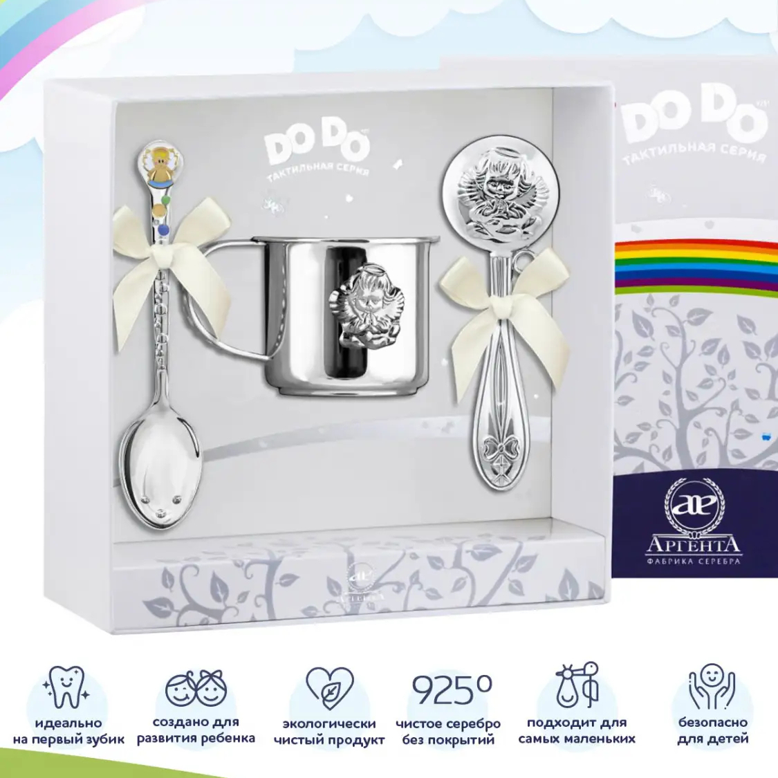 Серебряный набор для мальчика DODO "Ангел": кружка, погремушка, ложка с позолотой и с эмалью