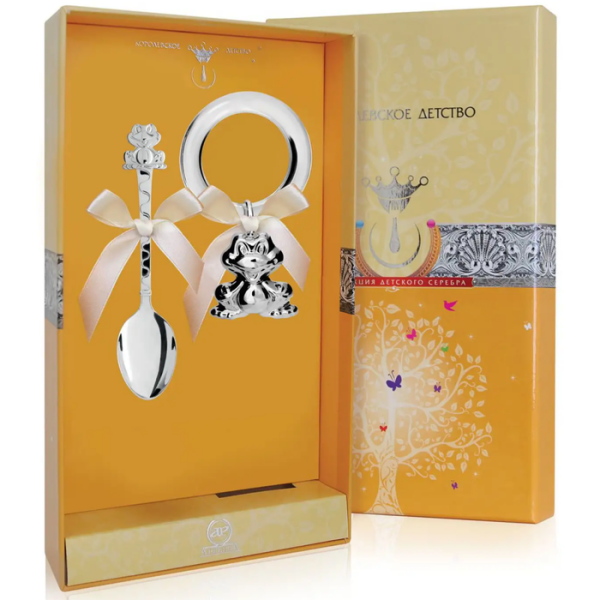 АргентаНабор серебряный для малышей КД "Мальчик": кружка, ложка, погремушкаНабор серебряный для малышей КД "Мальчик": кружка, ложка, погремушкаКоллекция КОРОЛЕВСКОЕ ДЕТСТВО - одна из самых широких и известных коллекций детского серебра в России. Она содержит множество очаровательных моделей серебряных ложек, вилок и ножей, погремушек и пустышек, поильников и кружек. Все детские серебряные приборы проходят строгий контроль качества. Экологическое серебро, произведённое непосредственно на фабрике, тщательная ручная полировка хлопковыми валиками делает изделия абсолютно безопасными для ребёнка. Благодаря дезинфицирующей функции серебра, регулярное использование серебряных приборов может поддержать естественный иммунитет организма и даже предотвратить некоторые из типичных детских болезней. Специалисты фабрики получили грант на применение сложной, но очень красивой техники гильоширования, которой пользовался известный Карл Фаберже. Это позволило создавать удивительно яркие и объемные изображения на изделиях. Коллекция полна милыми персонажами, которые станут для ребёнка верными друзьями.