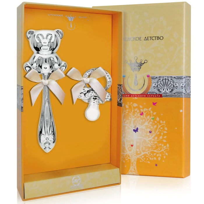 Серебряный набор для малышей "Медведь": погремушка и сувенир-пустышка