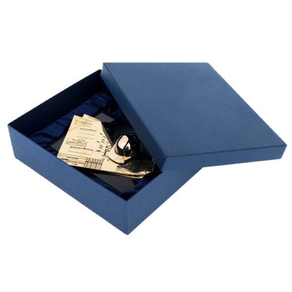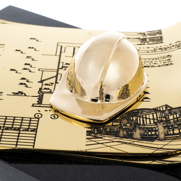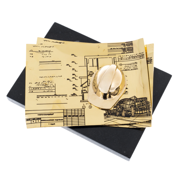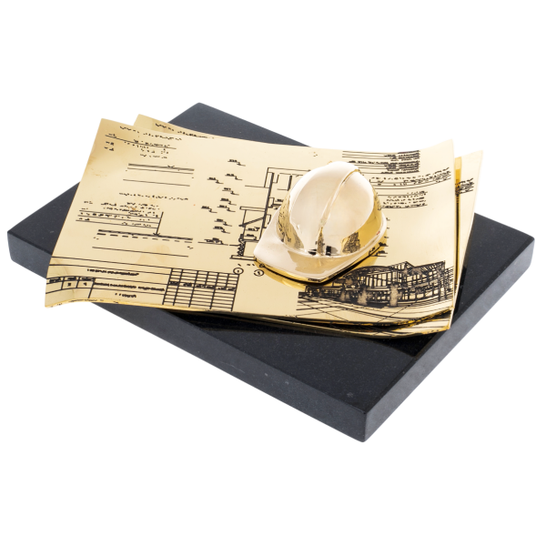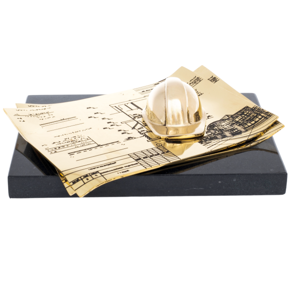 Композиция выполнена из латуни, установленная на массивное основание из долерита. На изящно выгнутых листах, имитирующих архитектурные чертежи, возвышается золотой строительный каск — знак ответственности, знаний и мужества тех, кто возводит города и формирует пространство будущего. Тончайшая гравировка подчёркивает внимательность мастеров к деталям, превращая технические линии в художественное высказывание.