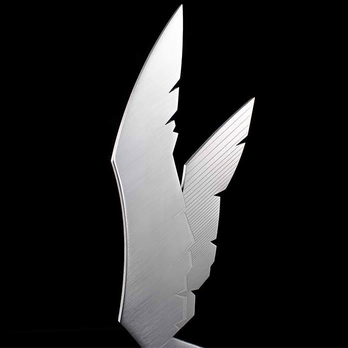 Сувенир «На крыльях успеха» — метафора стремительного роста и лидерства, зафиксированная в динамике металла. Лаконичное крыло из матовой стали парит над пирамидальным основанием, сочетая силу и лёгкость, устойчивость и движение. Чёткие грани, тонкая гравировка, контраст золота и чёрного подчеркивают характер — решительный, амбициозный, нацеленный на вершины.