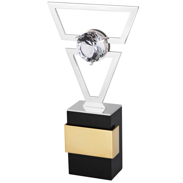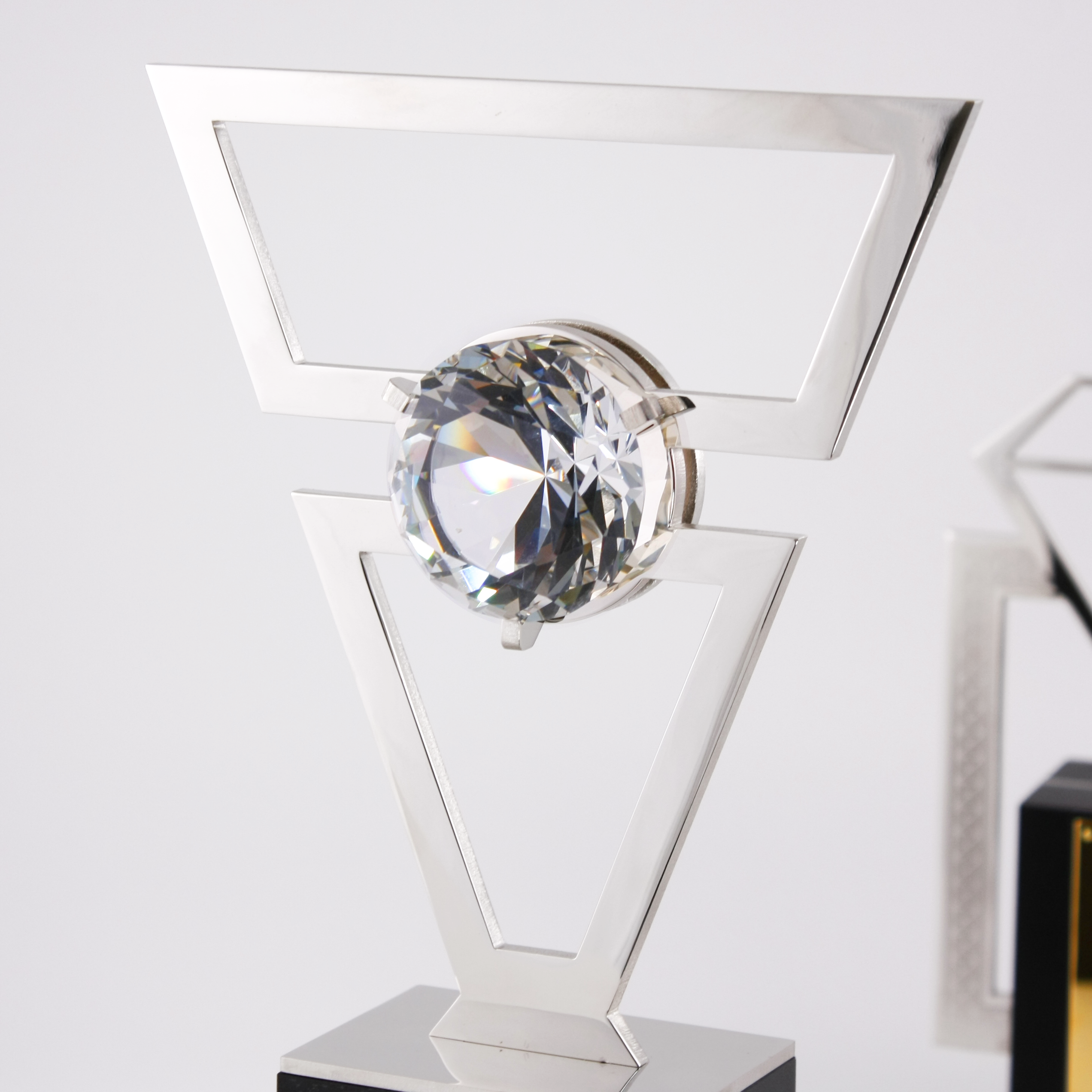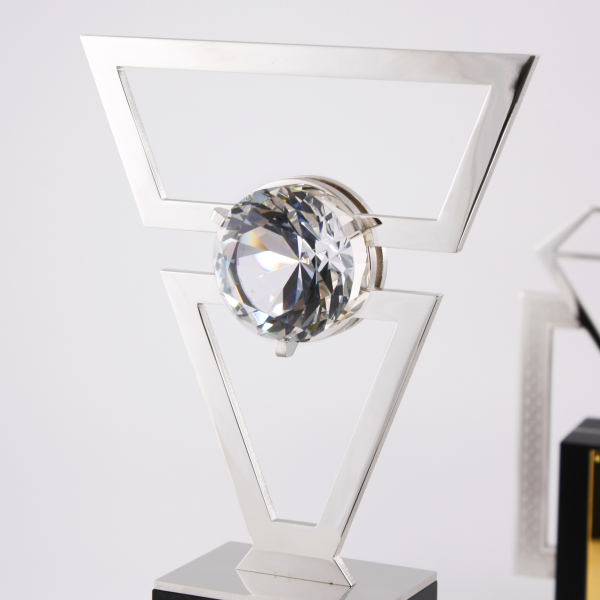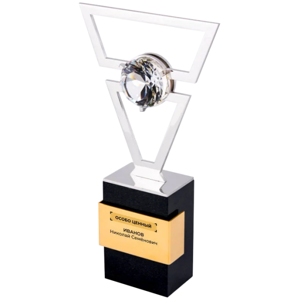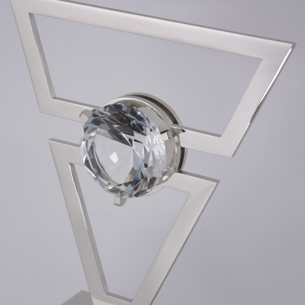 Массивное основание из тёмного дерева создаёт устойчивый фундамент, контрастируя с лёгкостью воздушной формы. Металлический каркас вырезан из блестящего сплава, отполированного до зеркального блеска. В центре — кристалл, заключённый в рамку — как символ ключевого звена, без которого система теряет смысл. Это сердце структуры, метафора человека, чья ценность определяется не титулами, а вкладом, влиянием и способностью вести за собой. Контраст металлов подчёркивает идею баланса между силой и утончённостью.