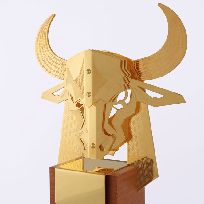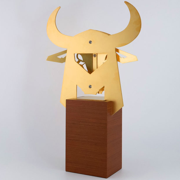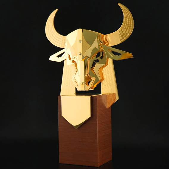 Корпоративный сувенир «Сила стремления» — образ уверенного и неукротимого движения вперёд. Маска быка, выполненная из глянцевого металла с золотым покрытием, символизирует энергию, напор и решительность. Геометричная структура рождает ощущение силы, собранной в единый вектор, а сложная прорисовка рогов и лба подчёркивает не только мощь, но и интеллект.