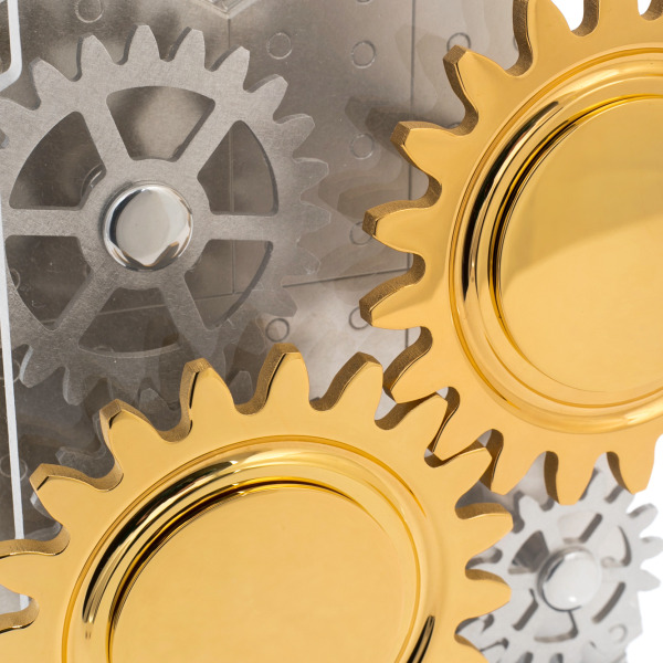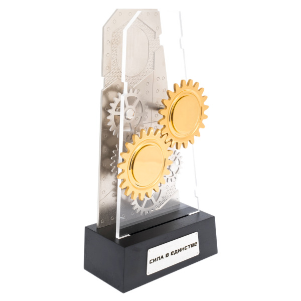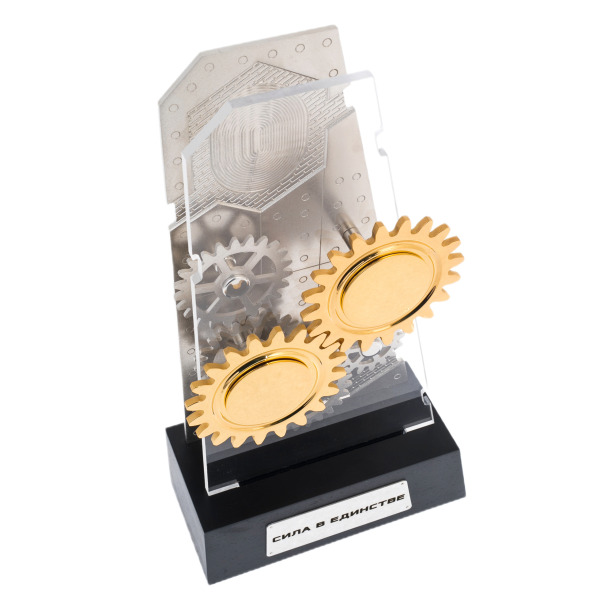 Композиция базируется на тяжёлом основании с лаконичной табличкой из металла, на которой выгравировано: «Сила в единстве». Такое решение делает акцент на главной идее — успех возможен лишь при слаженности. Контраст матового фона и зеркальной поверхности шестерён подчёркивает важность каждой индивидуальности в общем деле. Форма, пропорции и материалы выбраны так, чтобы предмет органично смотрелся в офисном интерьере и внушал уважение к команде.