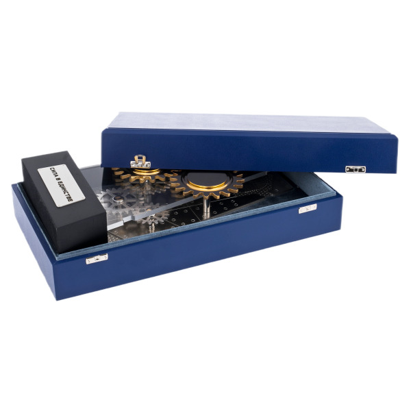 Настольный корпоративный сувенир «Сила в единстве» — это выразительный символ командной работы, в основе которой лежит чёткое взаимодействие и общая цель. На прозрачной акриловой панели закреплены шестерни из металла, две из которых покрыты благородным золотом и выделяются в центре композиции. Их движение предполагает включённость всех участников процесса: один механизм невозможен без другого. Фон стилизован под инженерные чертежи с гравированными элементами, создающими образ технологичности и точности.