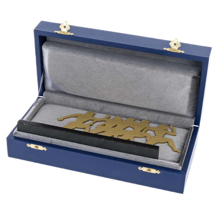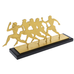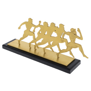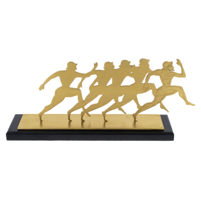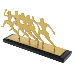 Сувенир «Задающий темп» воплощает идею движения, лидерства и постоянного стремления вперёд. Фигуры бегущих людей, выполненные из латунного листа, образуют ритм, символизирующий динамику командной работы, где каждый участник движется к цели, но лидер вырывается вперёд, задавая направление и темп всему коллективу. Лаконичность силуэтов подчеркивает чистоту замысла — здесь нет лишних деталей, только энергия, скорость и воля к победе.
