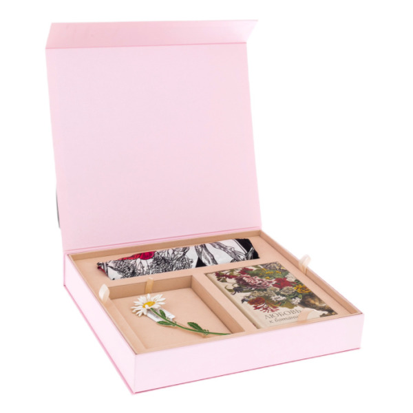 Женственный и утонченный набор состоит из шелкового платка, изящной серебряной броши с эмалями в виде цветка и из книги «Любовь к ботанике».