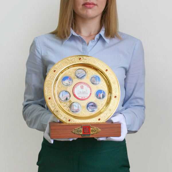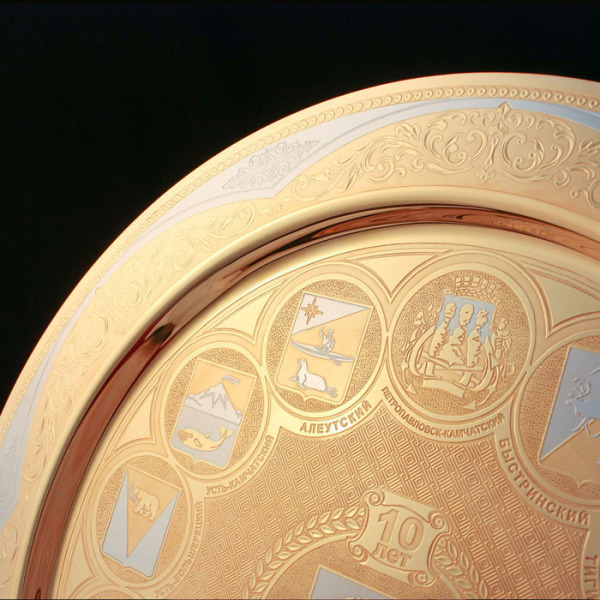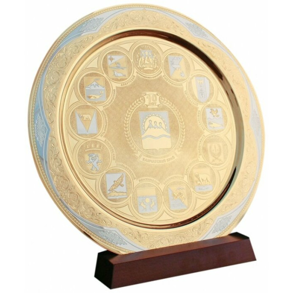 Подарочная тарель, отражающая в металле фирменный бренд региона или компании, станет приятным подарком для ее обладателя и подчеркнет его вклад в развитие компании или отрасли.
