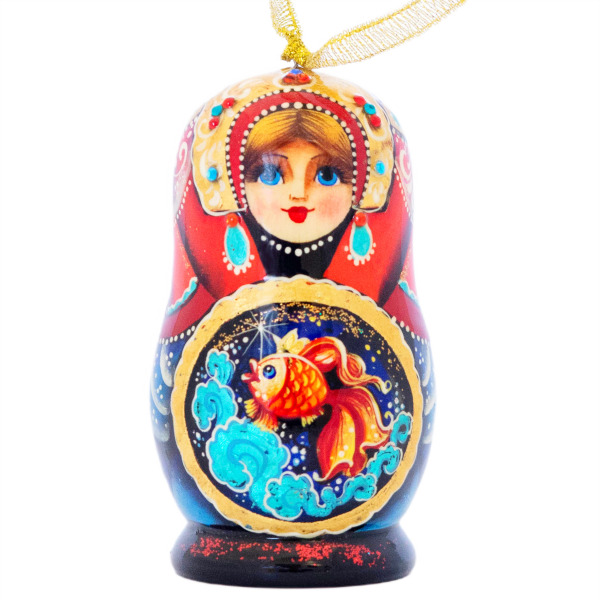 Елочная игрушка-матрёшка "Золотая рыбка", созданная из благородной липы и расписанная вручную, переносит вас в мир, где сказка оживает и находит своё отражение в каждом штрихе и блике. Красный фон, словно бархат королевской мантии, символизирует силу и вечную притягательность роскоши, а золотые детали наполняют образ светом и благородным сиянием.