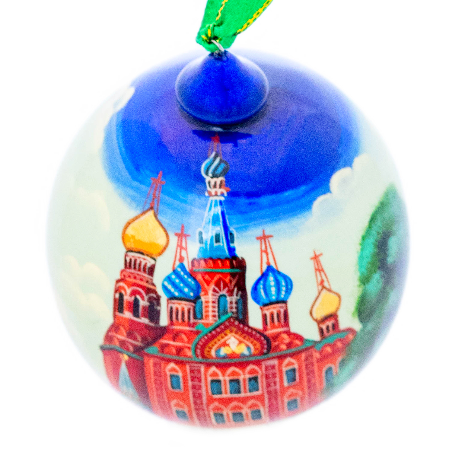 Фронтальная часть шара украшена великолепным образом, где золотые купола храма устремляются ввысь, словно стремясь коснуться неба. Красные стены здания пылают, как само сердце города, а лазурные и золотистые купола венчают его торжественно и гордо. Художник выписал каждую деталь с безупречной точностью — от арок и окон до тончайших теней, подчёркивающих объём архитектуры. Густая зелень деревьев обрамляет композицию, добавляя ей гармонии и создавая ощущение умиротворения.