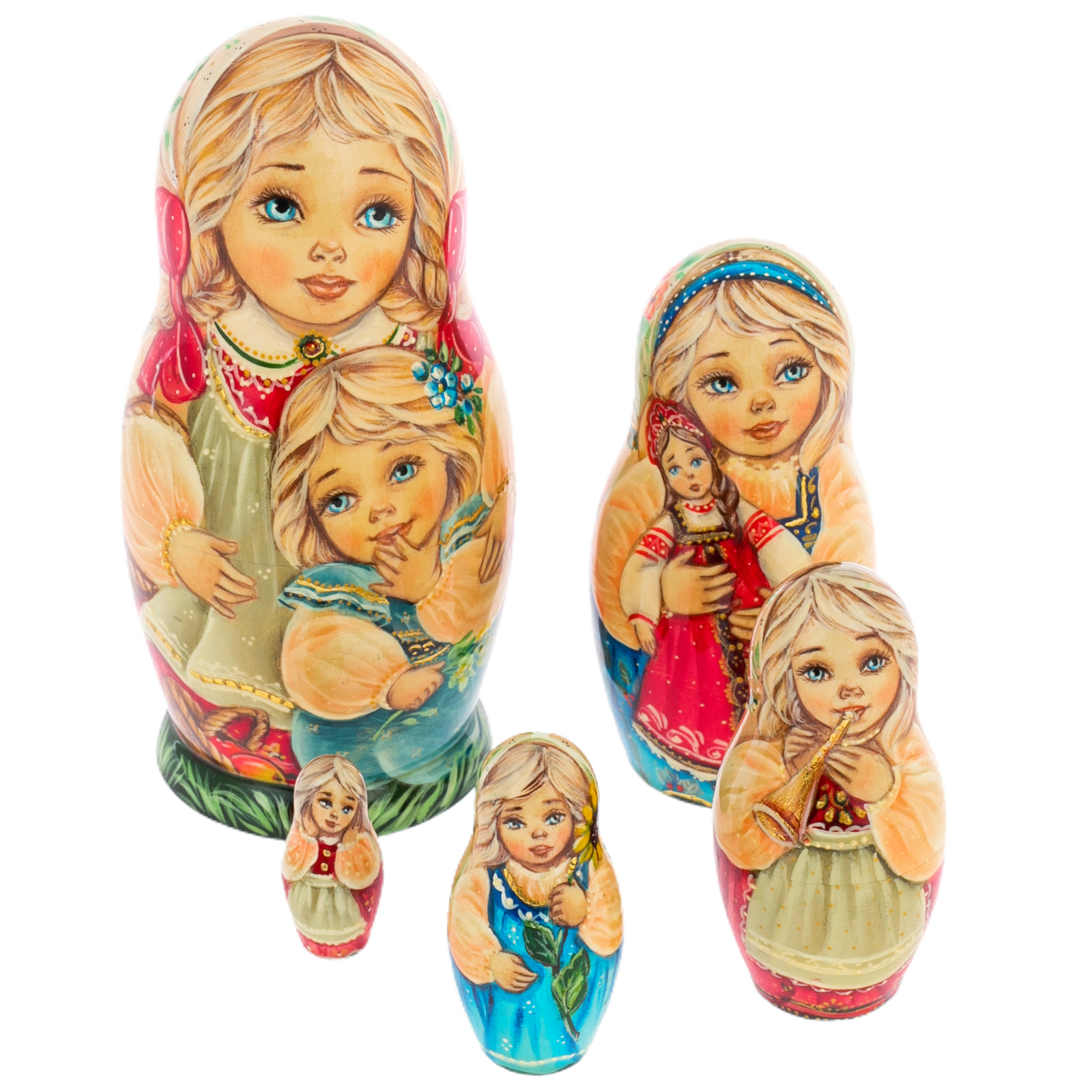 Очаровательная матрёшка "Дети" раскрывает мир нежности, семейного тепла и трогательных моментов детства, воплощённый в изысканной ручной росписи. Этот уникальный набор, состоящий из пяти фигур, представляет собой не просто произведение искусства, но целую повесть, где каждый персонаж — часть общей истории, пронизанной любовью и заботой.