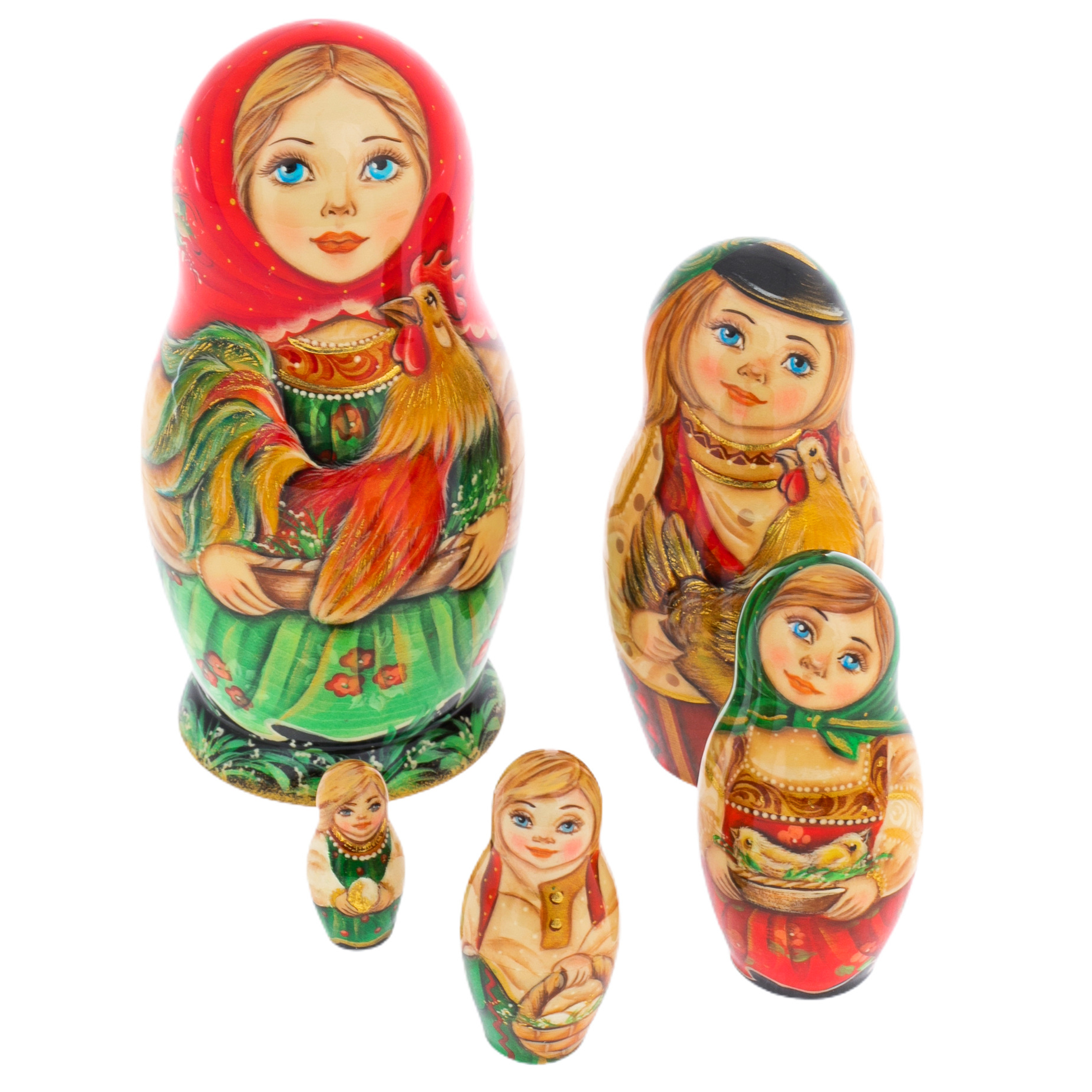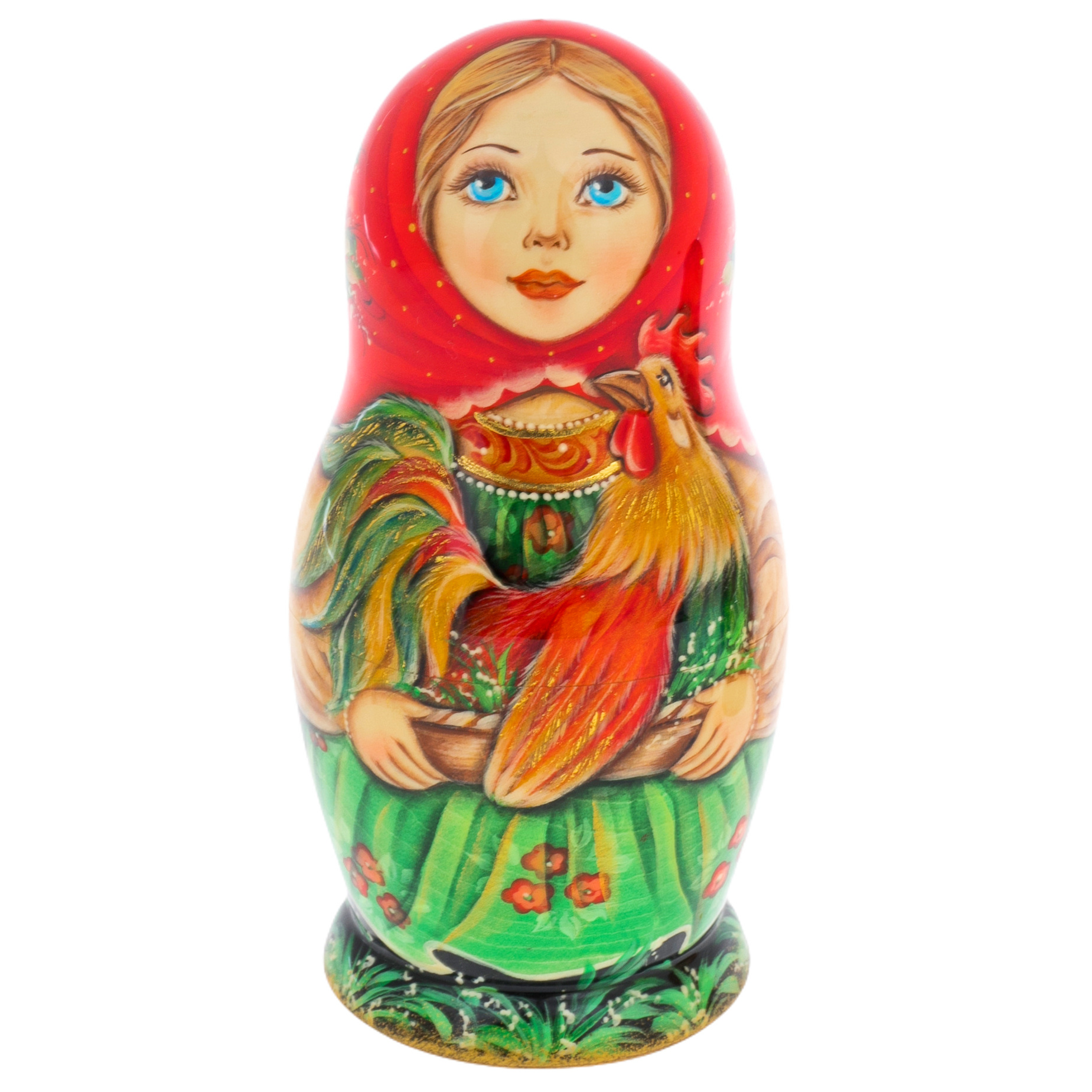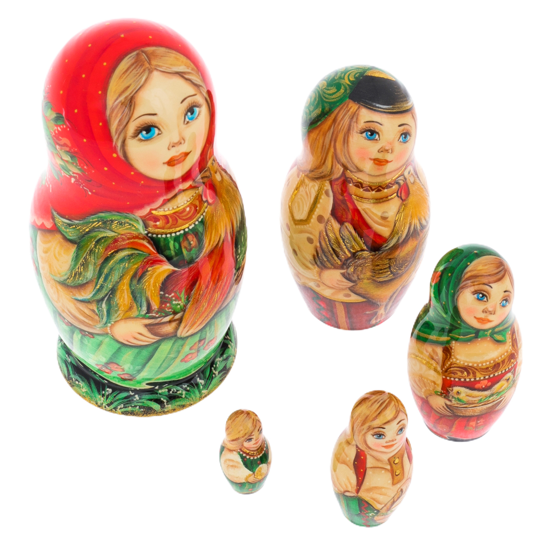 Матрешка на 5 мест "Девочка с петухом в красном платке" 15 см