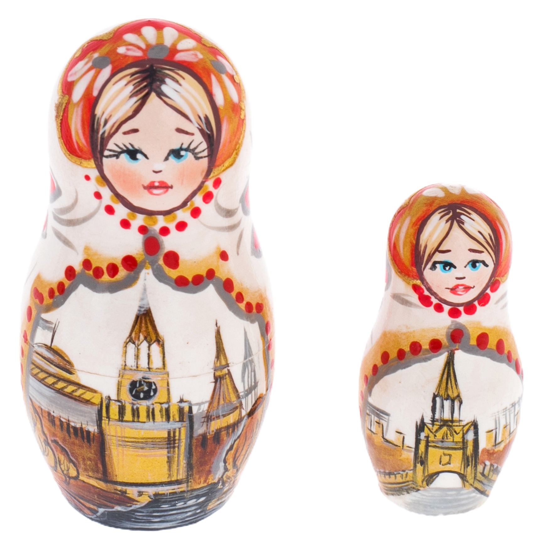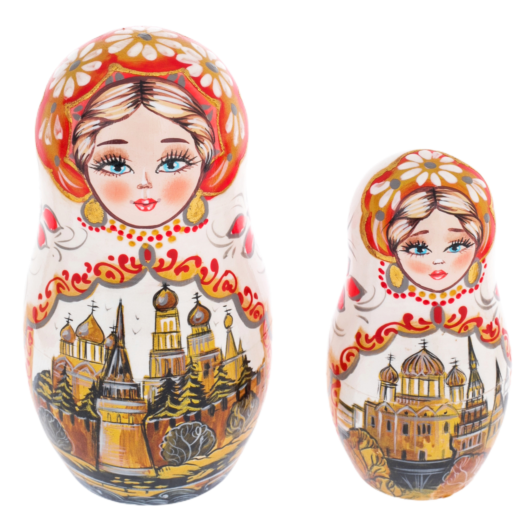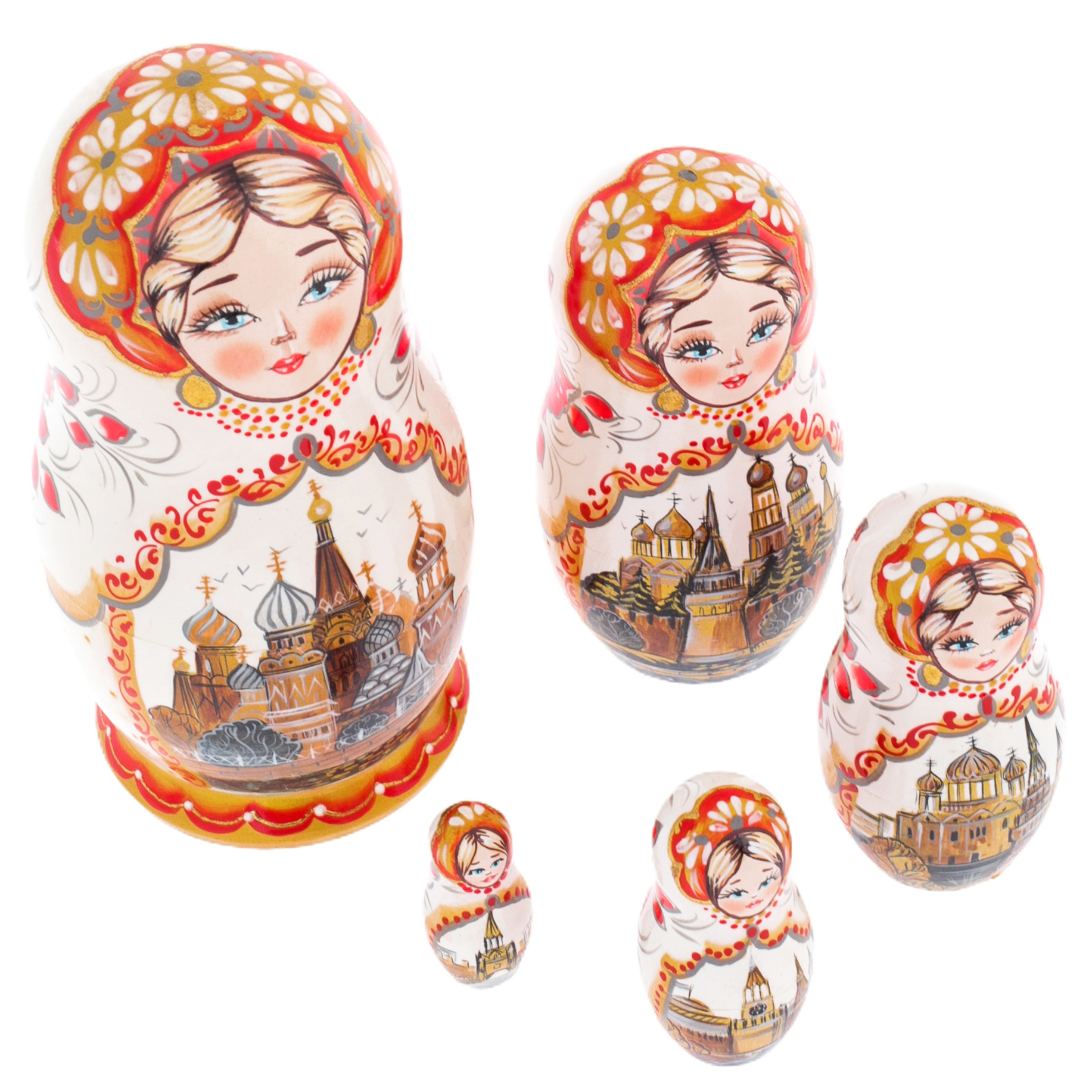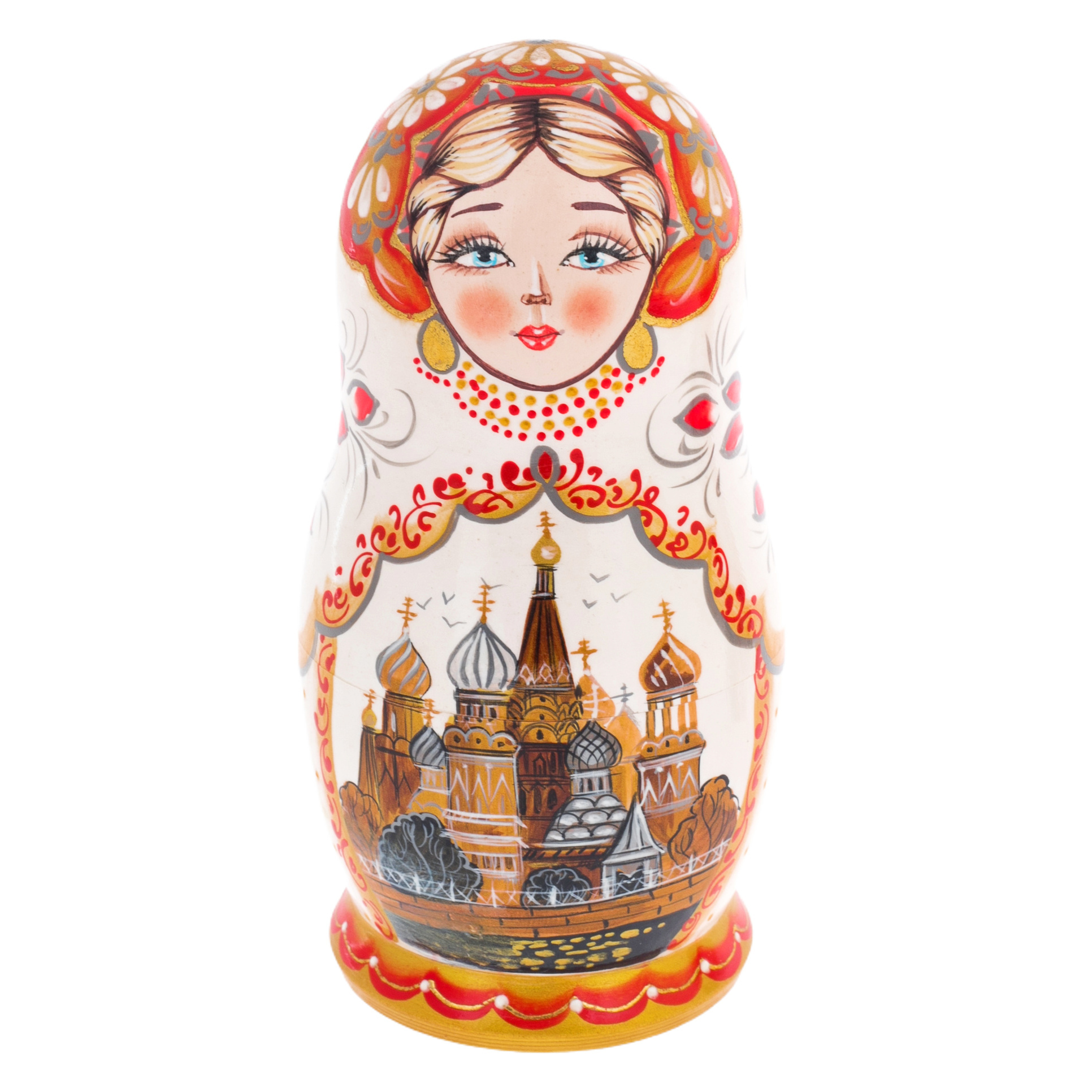 Утончённая матрёшка "Москва" — настоящий гимн величию российской столицы и её легендарной архитектуры. Каждый элемент этого набора — словно маленькая поэма, посвящённая символам могущества, истории и культуры. Белый фон, отсылающий к чистоте и благородству, подчёркивает золотые и красные акценты, создавая ощущение царственности и роскоши.