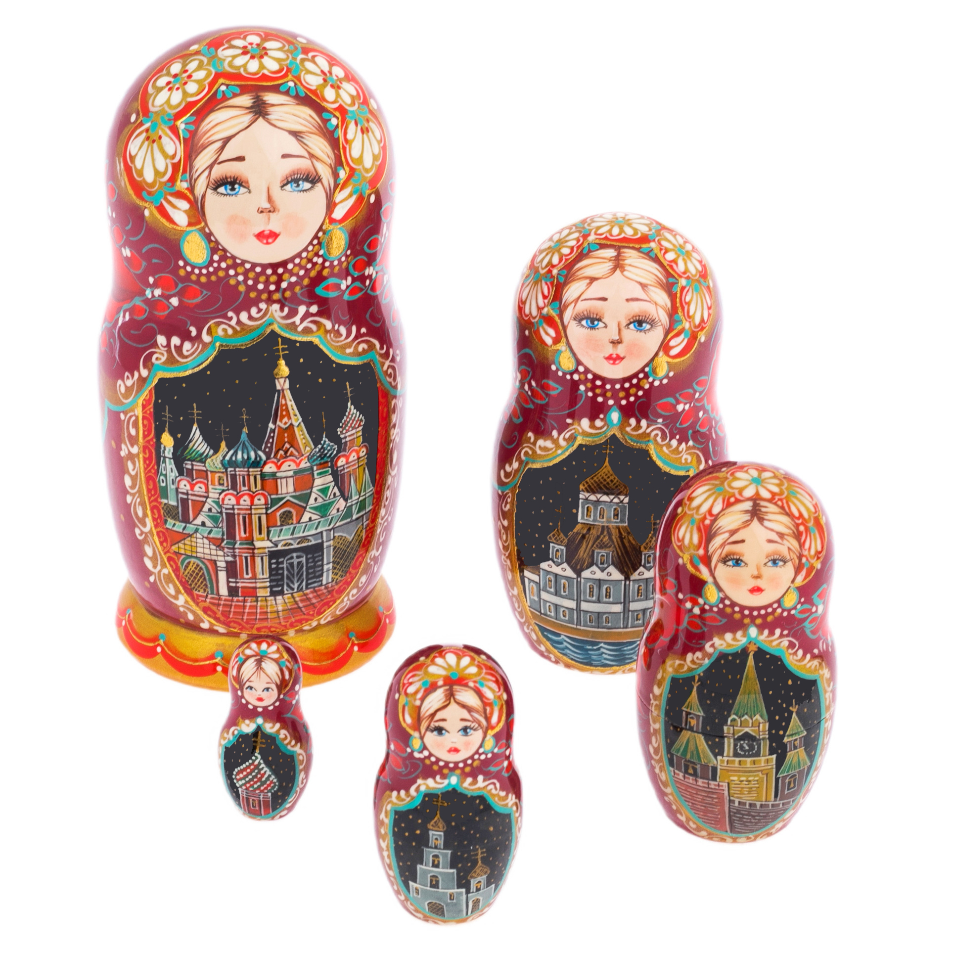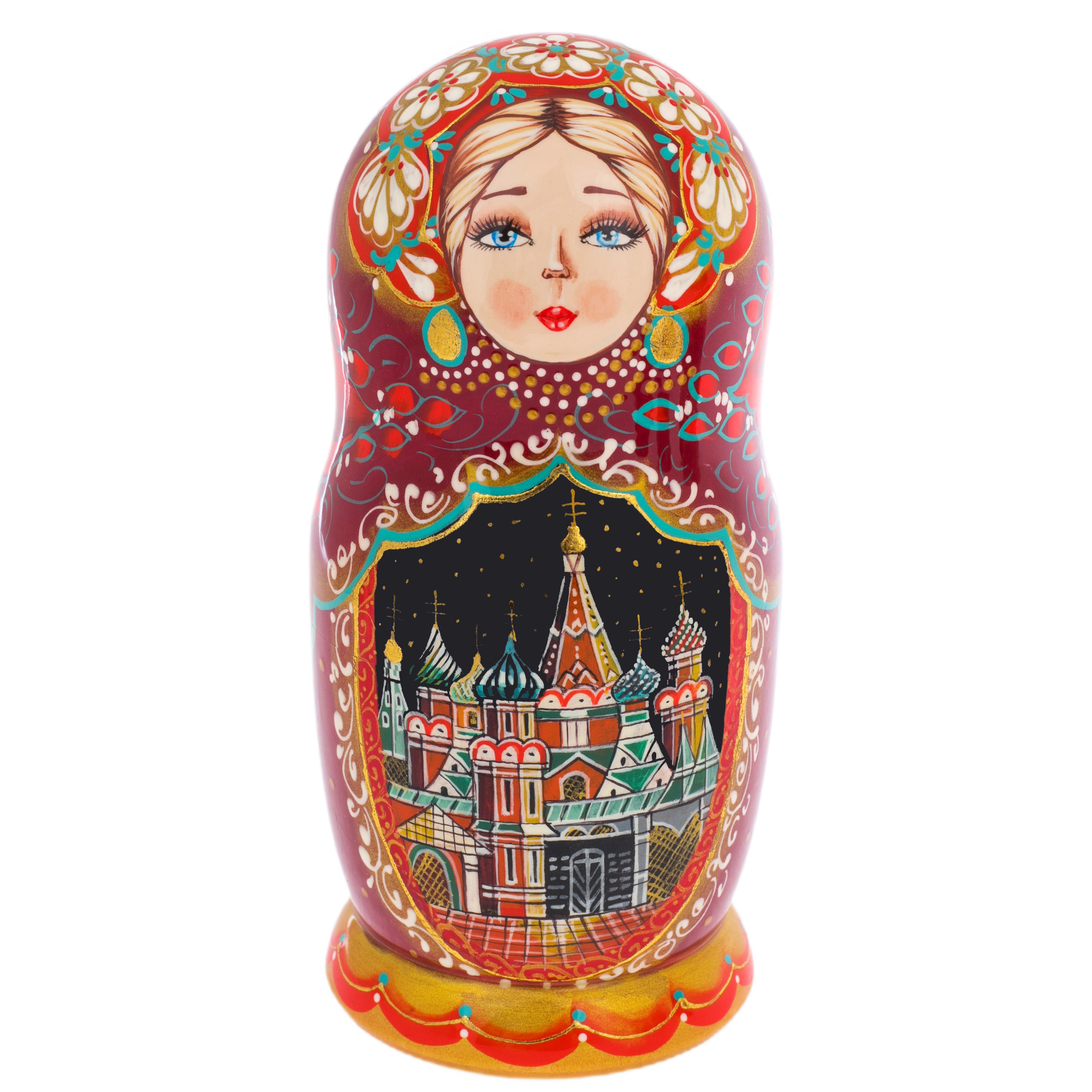 Матрешка "Ночная Москва" – воплощение изысканности и величия столицы, окутанной таинственным сиянием ночного неба. Ее глубокий бордовый фон, словно бархатная ткань, обрамляет архитектурные символы Москвы, превращая каждый из них в драгоценный камень в короне русского искусства. Центральная фигура – Собор Василия Блаженного – сверкает золотыми куполами, которые напоминают звезды, освещающие путь искателям красоты и вдохновения.