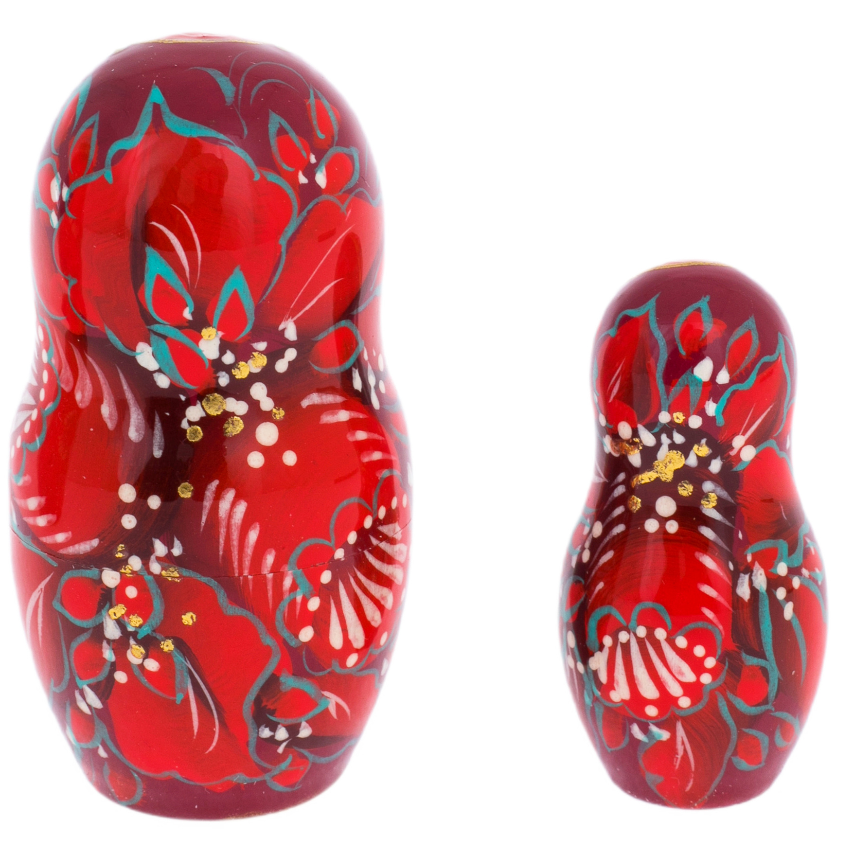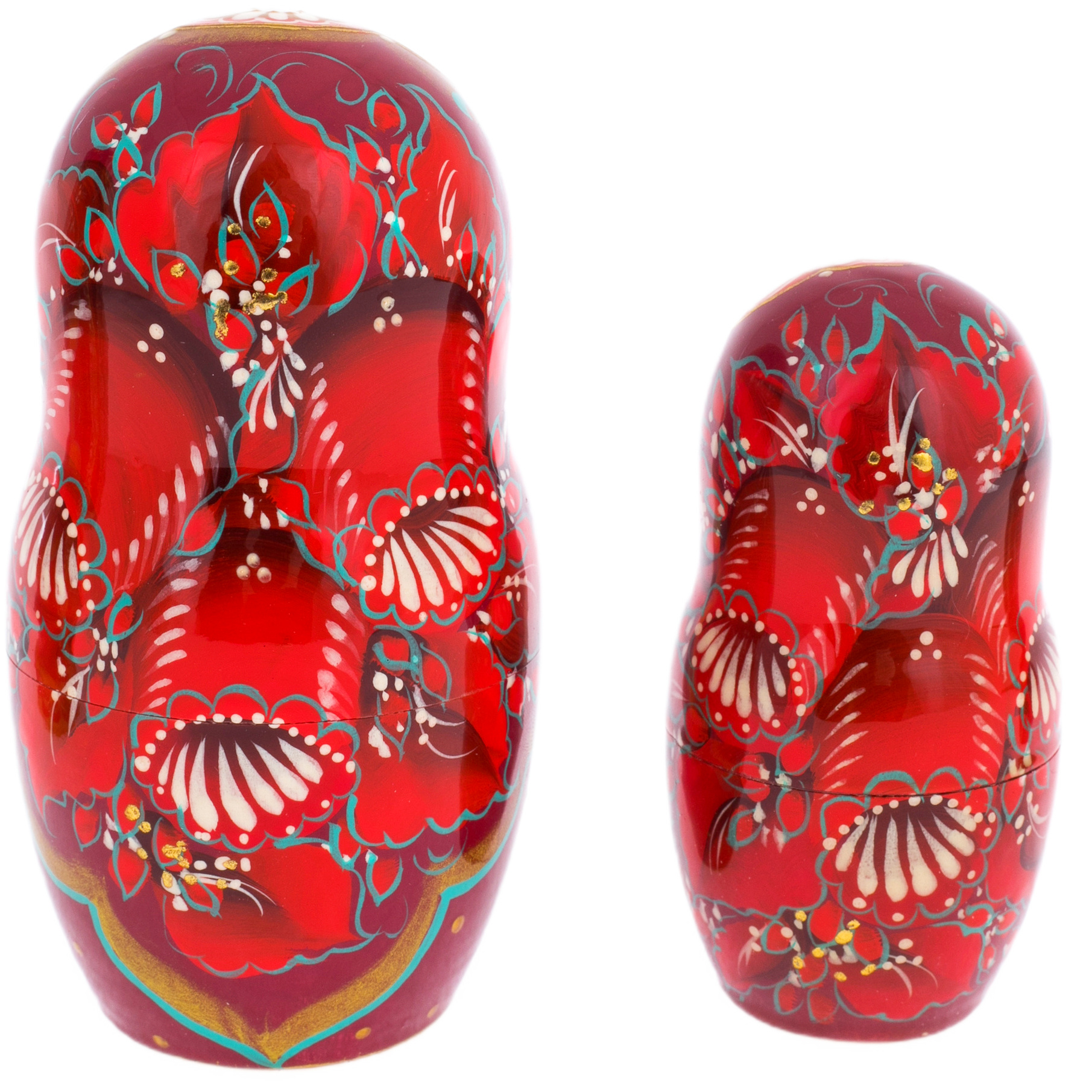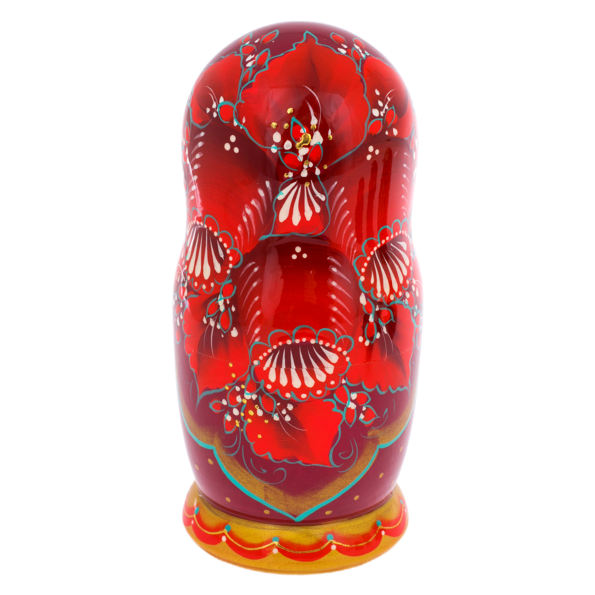 На оборотной стороне матрешки раскинулись роскошные цветочные узоры, выполненные в красных, бирюзовых и золотых тонах. Они придают изделию нотку нежности, напоминая о гармонии природы и городской архитектуры. Эти мотивы, вдохновленные русским народным искусством, добавляют глубину и подчеркивают связь современного творчества с традициями прошлого.