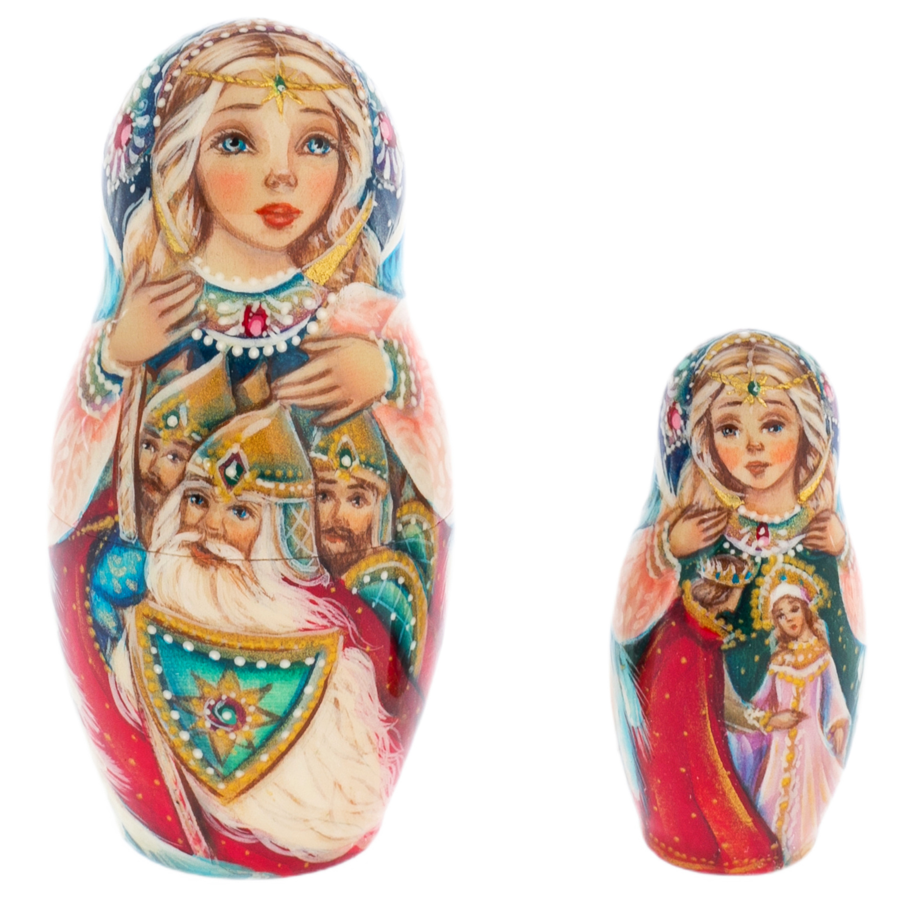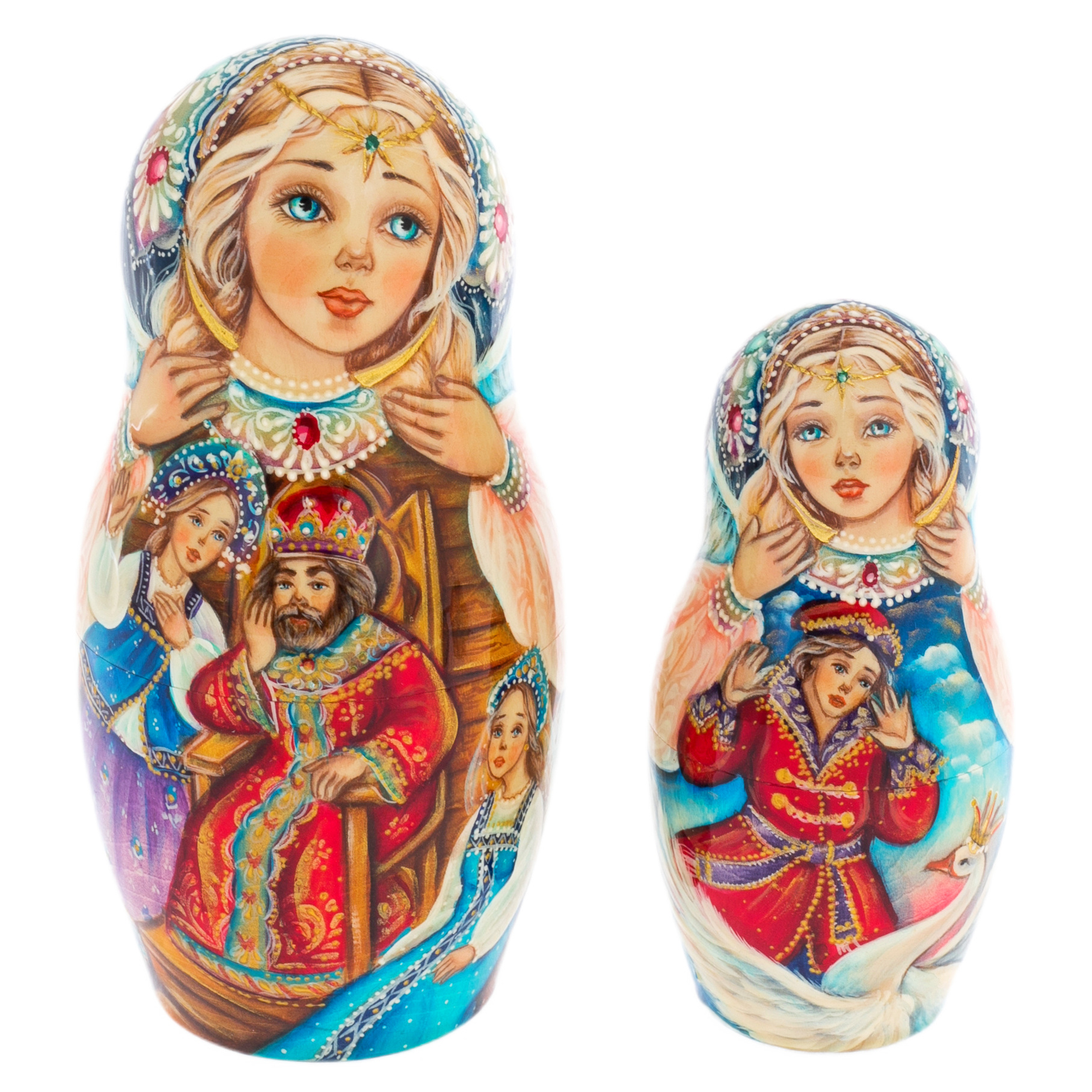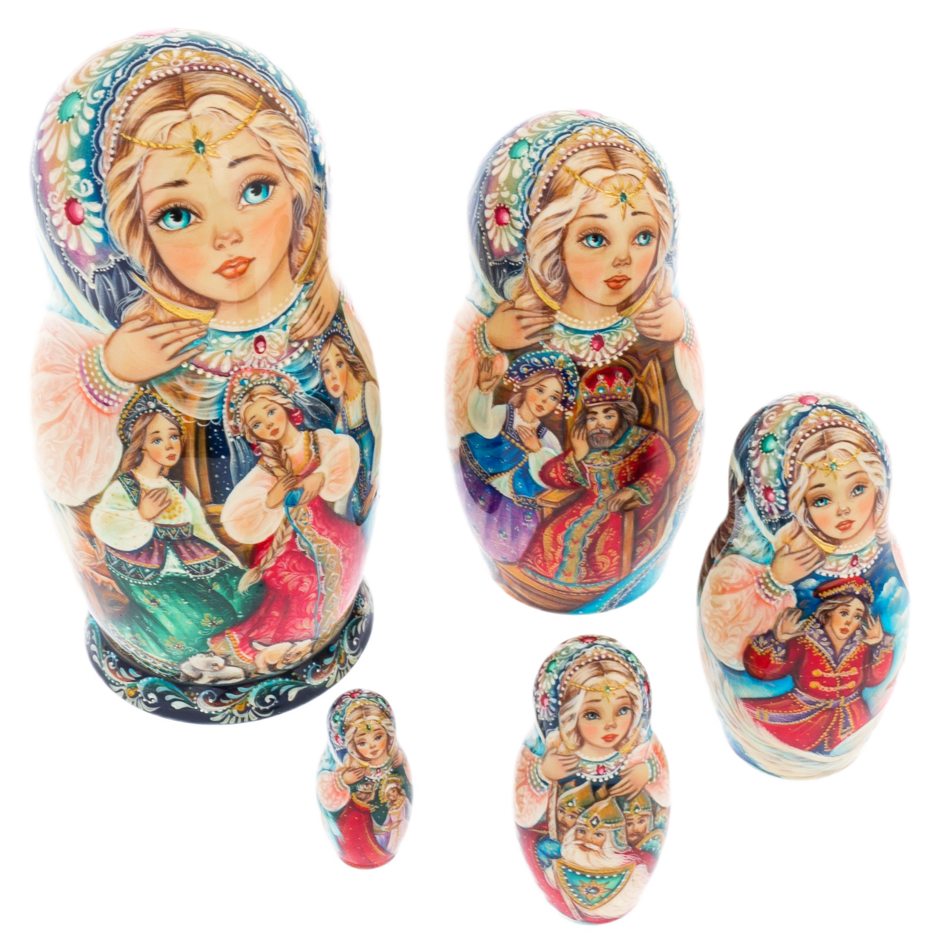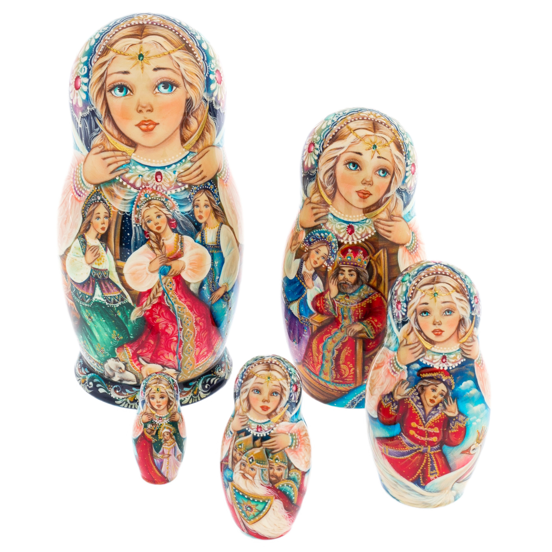 Эта матрешка воплощает магию русской сказки, словно ожившей под кистью мастера. Пять фигур, каждая из которых таит в себе уникальный сюжет, приглашают в мир легенд и фантазий. Лица героев, полные нежности и величия, переносят нас в атмосферу добра, мудрости и волшебства. Искусство, проявленное в каждой детали, словно шепчет нам истории, переданные через века.