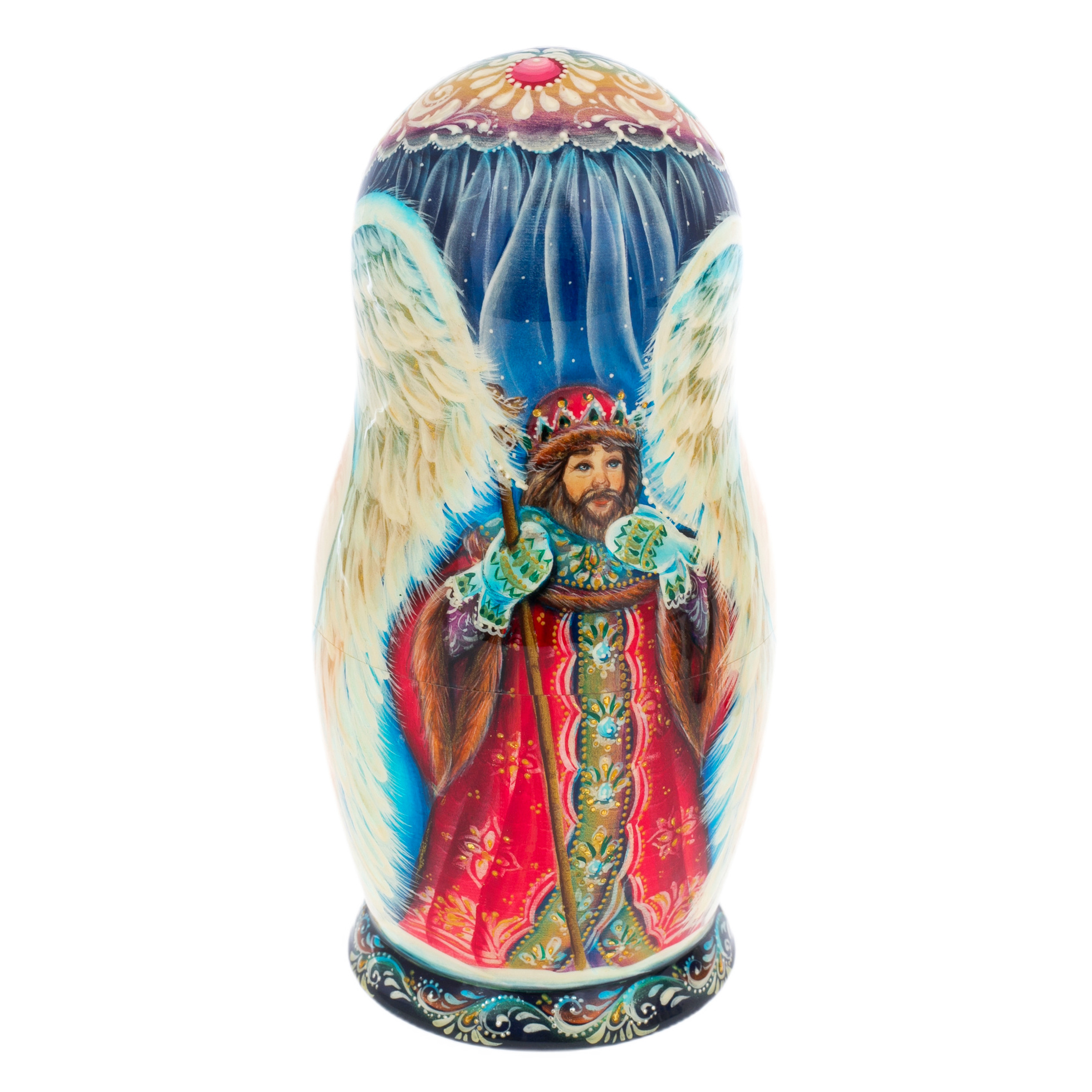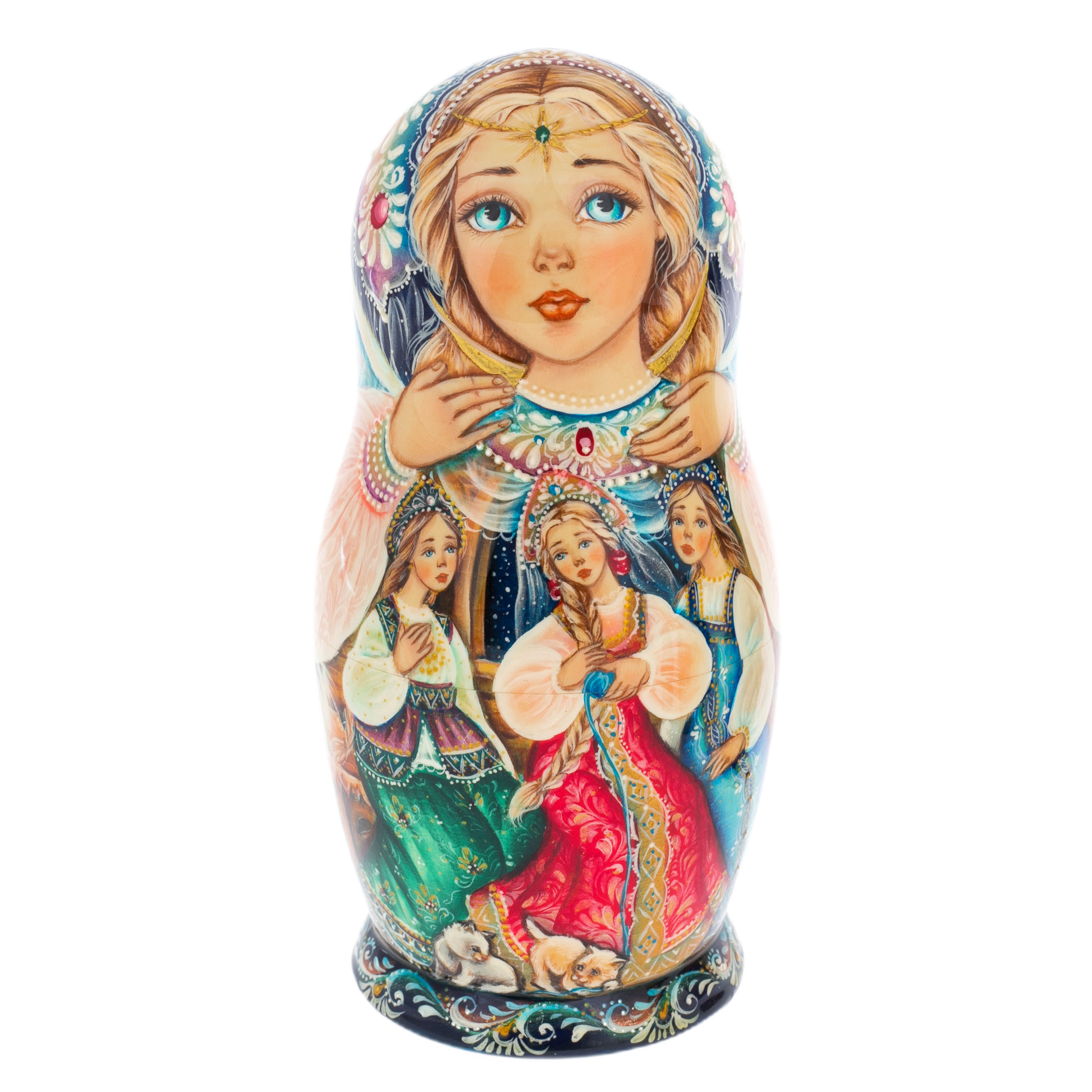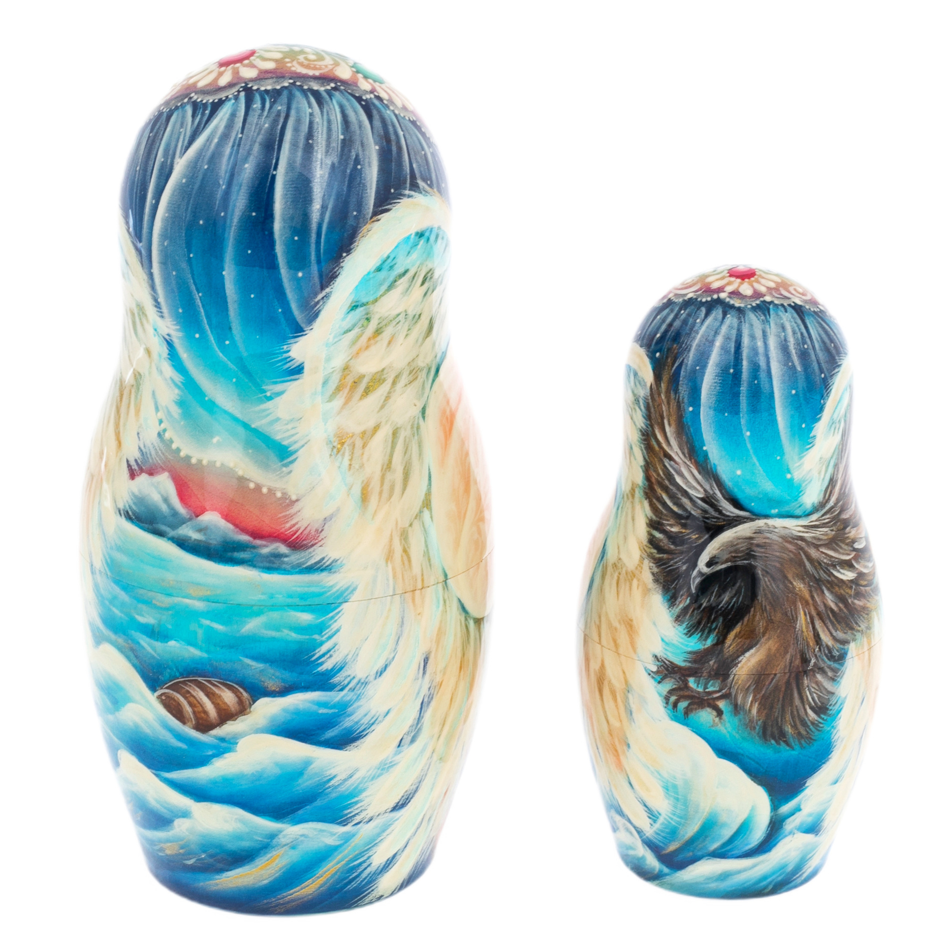 Обратная сторона матрешек открывает совсем иную грань произведения. Здесь разворачивается небесная симфония, в которой парят ангелы, а белые орлы расправляют свои крылья над голубыми облаками. Этот небесный мотив, наполненный символами защиты и силы, придает матрешке особую значимость и делает ее не просто украшением, но и настоящим оберегом. Мягкие пастельные тона небесной росписи создают контраст с яркими сюжетными сценами, наполняя изделие особым шармом.