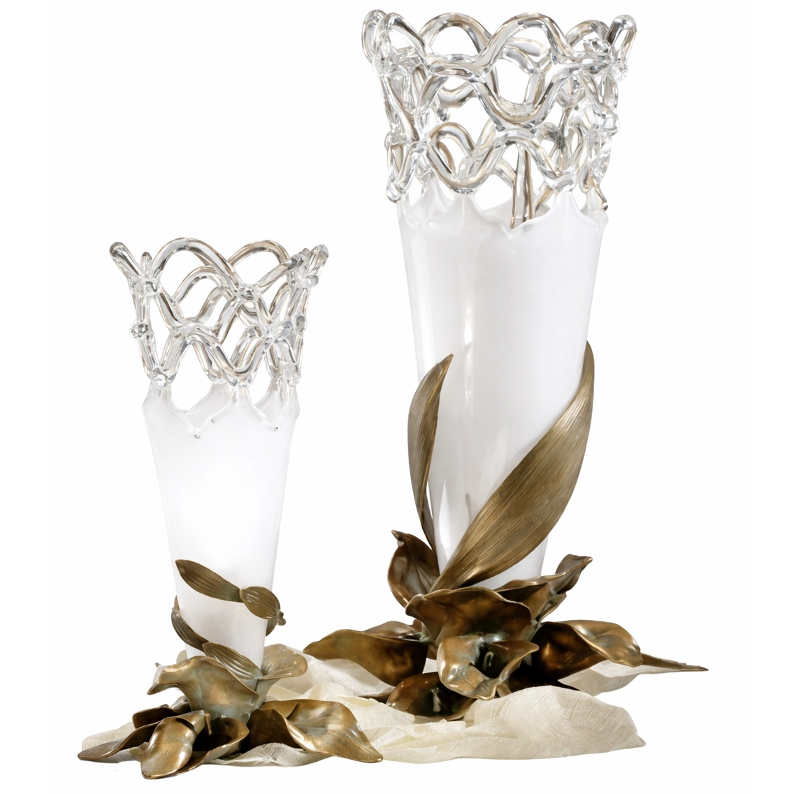 Верхнюю часть завершает декоративная композиция из тончайших фарфоровых цветов, собранных в подобие цветущего букета, словно выросшего из самой чаши. Тонкая проработка лепестков, листьев и бутонов производит впечатление живого хрупкого великолепия, сохранившегося вне времени. Акценты из позолоты по ободкам, ручкам и подставке придают объекту сдержанный блеск, гармонируя с изысканным основанием из золотистого металла на архитектурной базе.