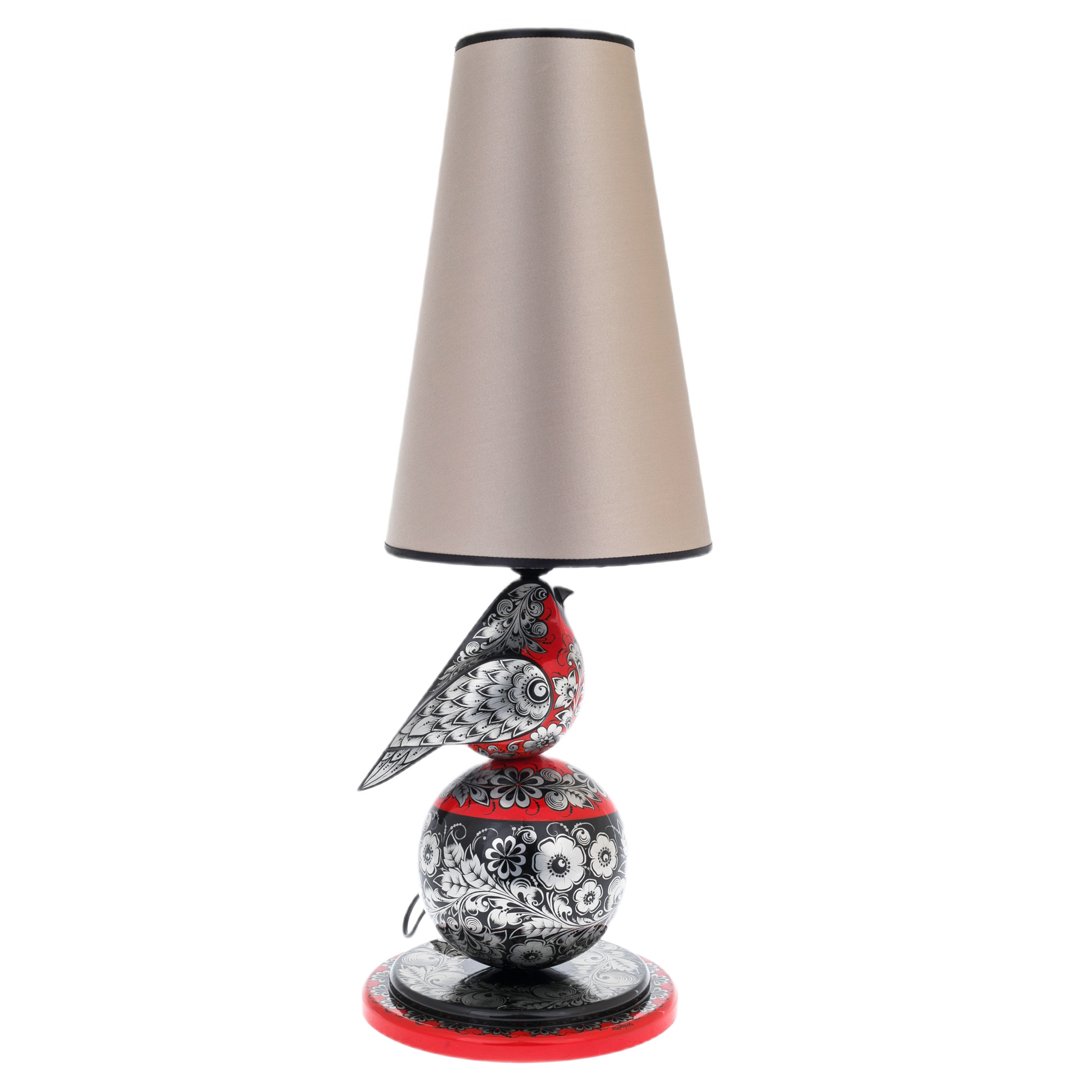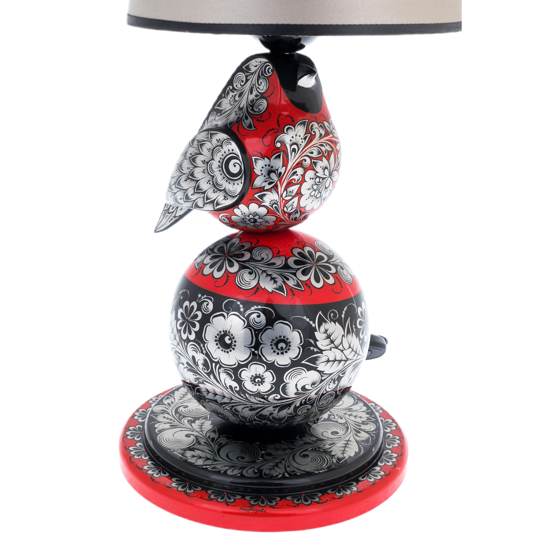 Основание, выполненное в форме округлых сфер, увенчанных скульптурным образом воробья, поражает своей детализацией. Каждая линия росписи, нанесённая вручную, словно оживает, рассказывая о мастерстве и терпении, вложенных в создание этого шедевра. Контрастные оттенки чёрного, алого и серебристого создают яркий визуальный акцент, притягивающий взгляд, а флоральные узоры, традиционные для Хохломы, символизируют природу, изобилие и жизненную энергию.