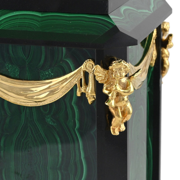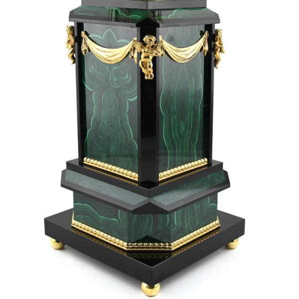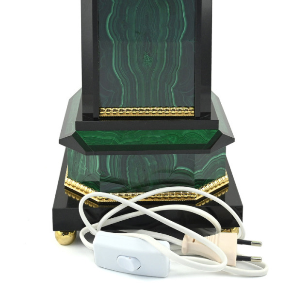 Детали арматуры выполнены из латуни с золочением, украшены тонкой резьбой и изящными архитектурными элементами. Контраст зелёного малахита и золотых акцентов придаёт предмету торжественность и царственную выразительность. Такая лампа не просто освещает пространство — она наполняет его ощущением вкуса, власти и внутреннего достоинства. Включённая лампа будто оживляет природный камень, усиливая переливчатую игру света на его поверхности.