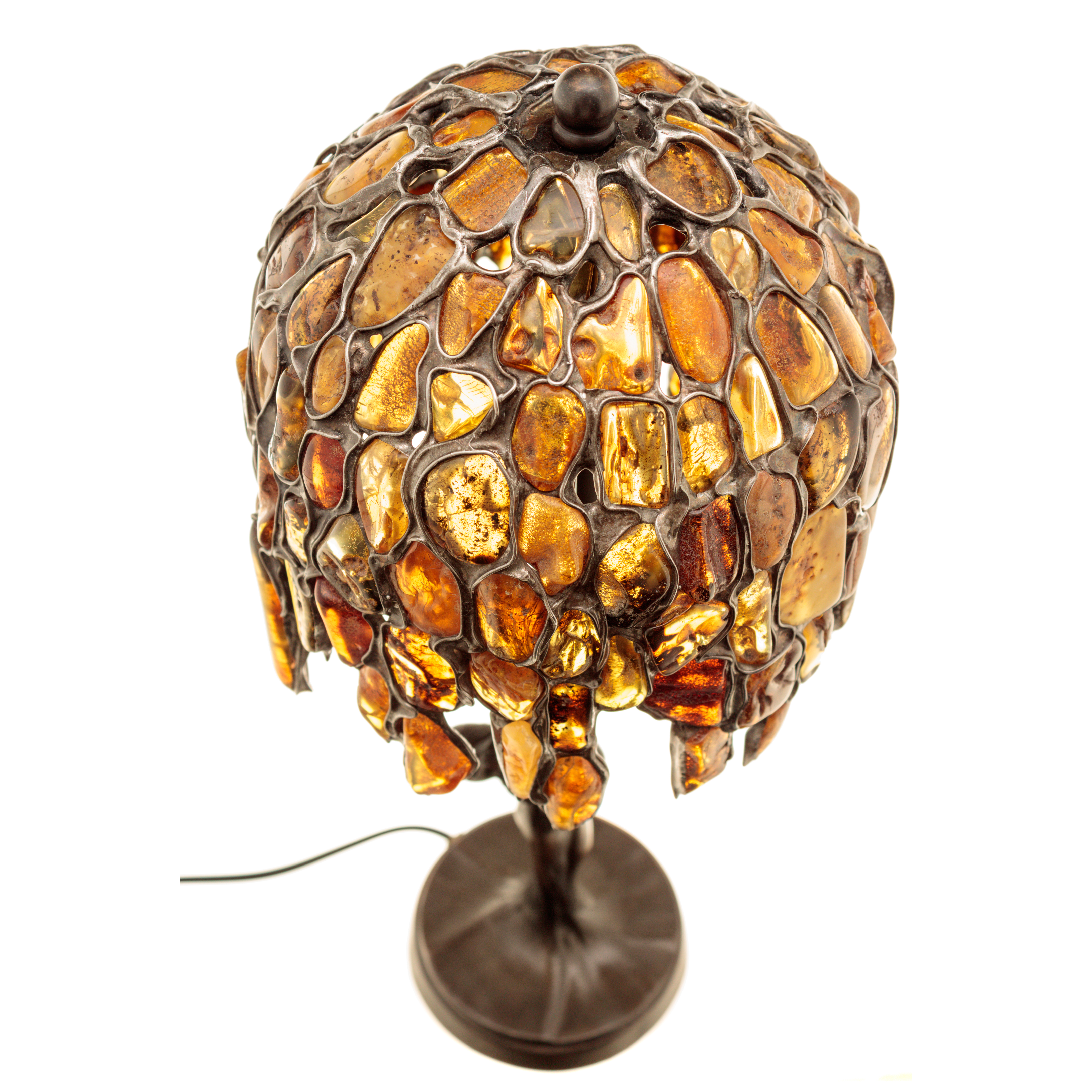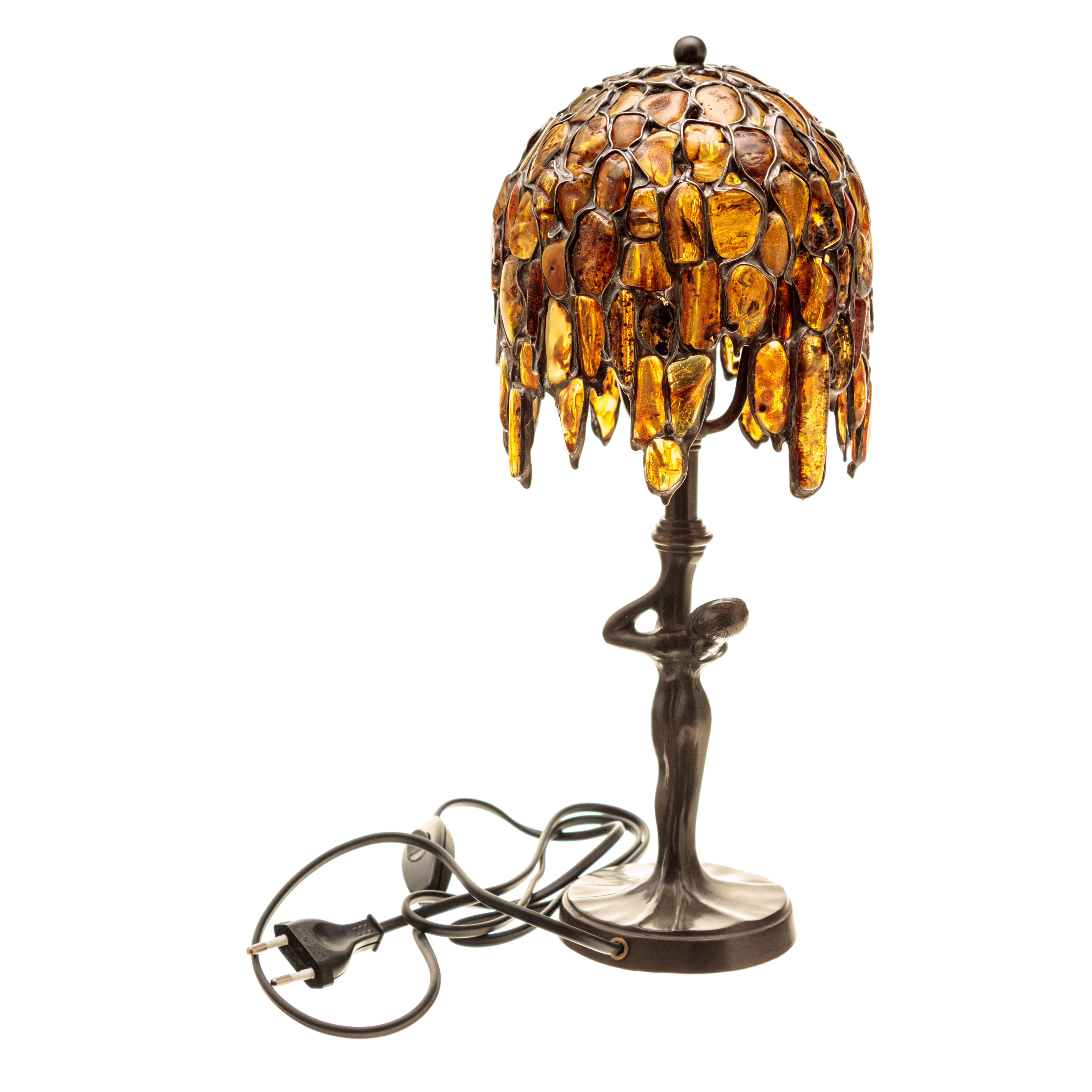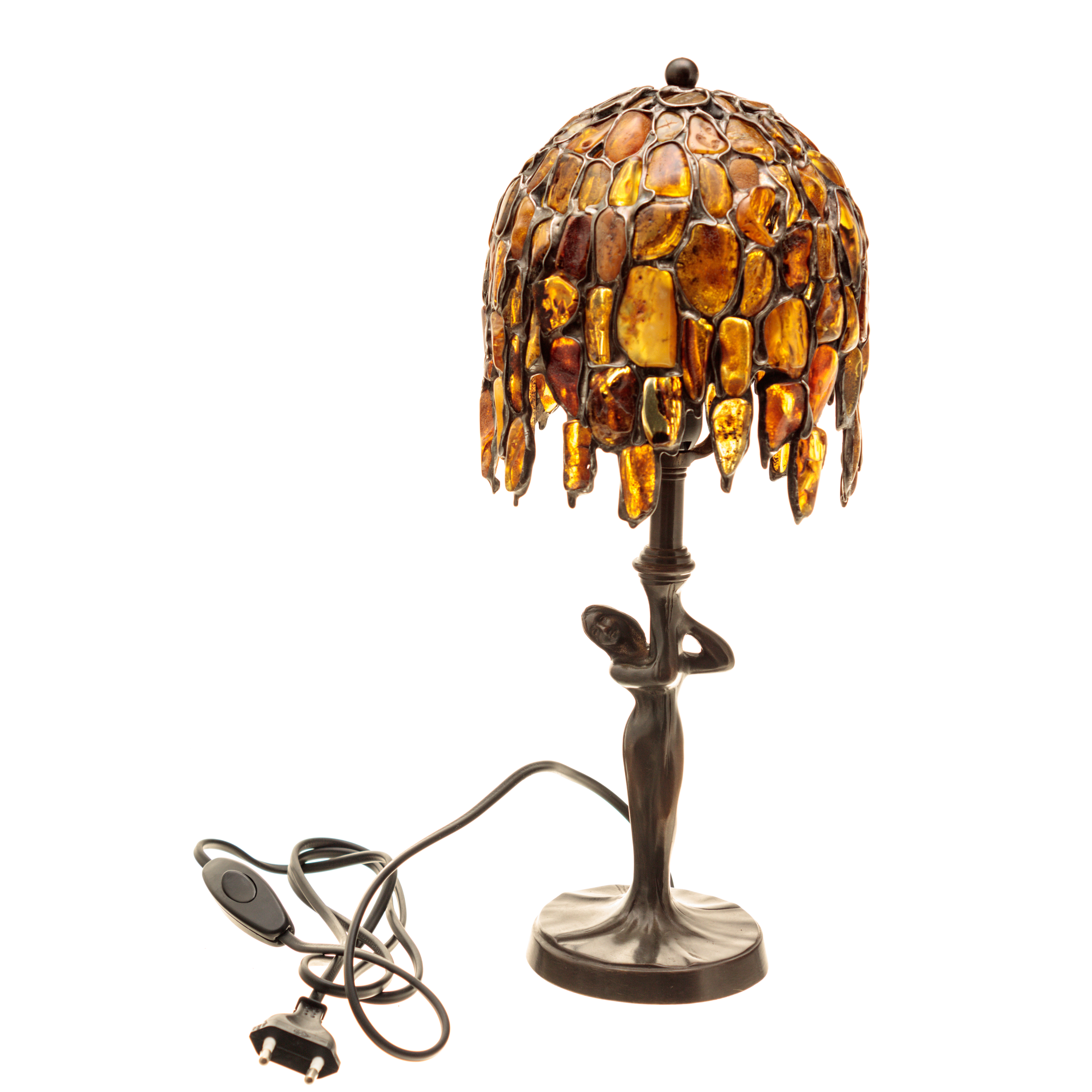 Настольная лампа из бронзы изготовлена в технике художественного литья, а абажур декорирован кусочками натурального янтаря. Ножка лампы выполнена в виде женской фигурки.