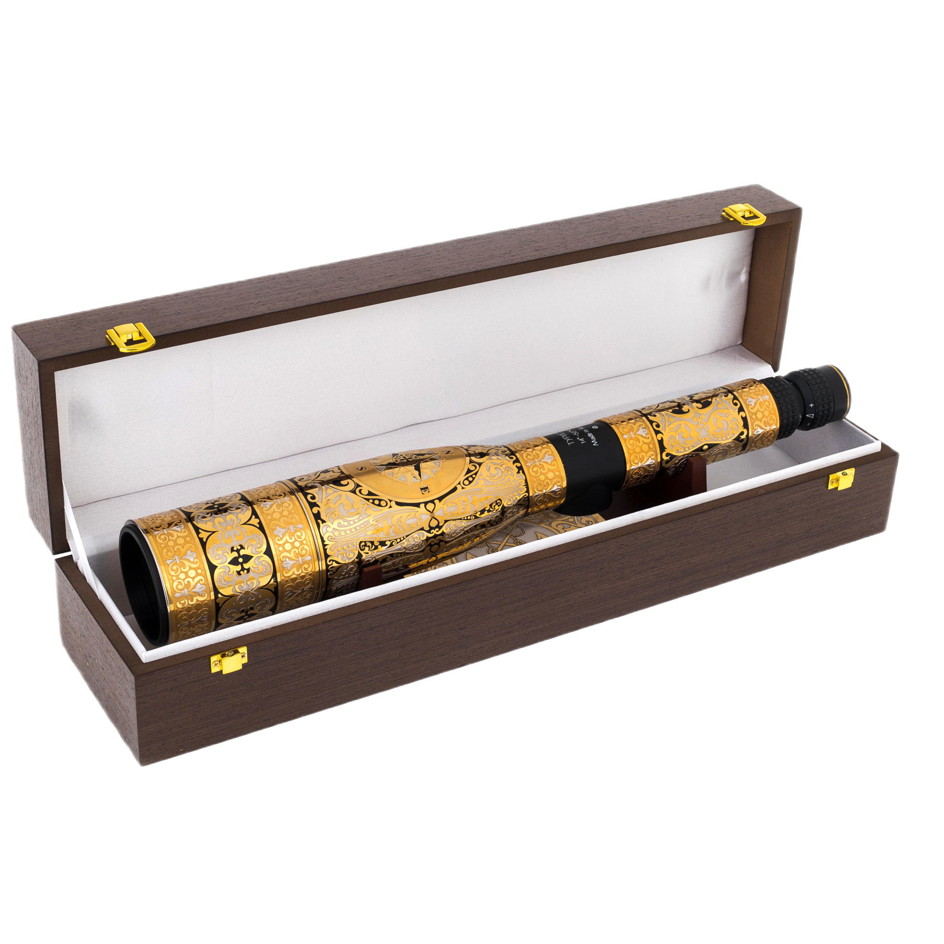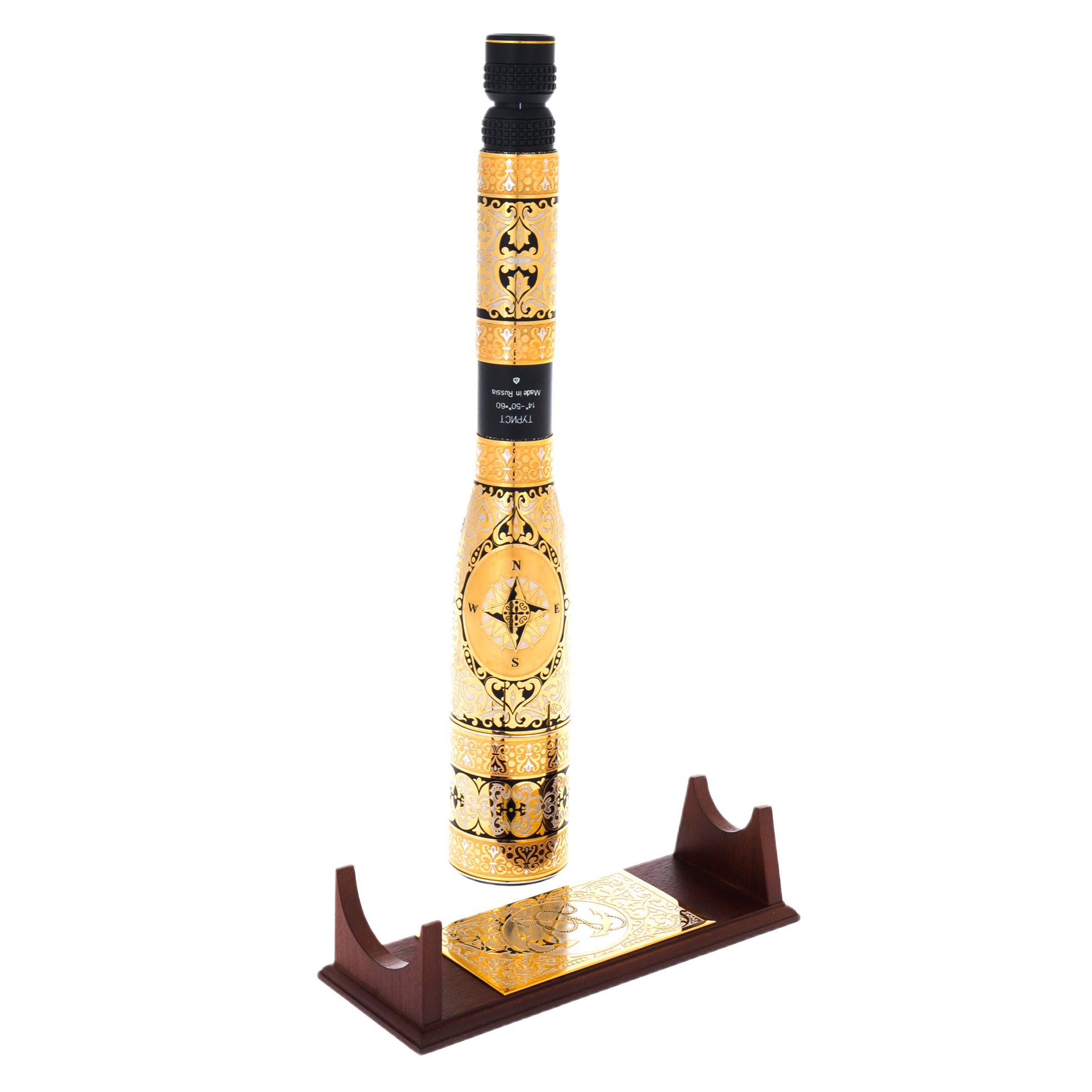 Труба подзорная "Морская. Роза ветров" на подставке, ЗлатоустТруба подзорная "Морская. Роза ветров" на подставке, ЗлатоустПодзорная труба «Морская. Роза Ветров» – изысканный предмет, созданный в лучших традициях златоустовского искусства, объединяющий функциональность и художественное совершенство. Каждая деталь этого шедевра отражает мастерство оружейных граверов, перенесенное на предмет элитной атрибутики. Основание корпуса, выполненное из металла, украшено роскошной гравировкой по золоту, дополненной чернением и серебряной инкрустацией. Центральный элемент – объемное изображение розы ветров, символизирующей верность избранному пути и поиски неизведанных горизонтов. Ее грани, тонко прорисованные вручную, играют светом, создавая ощущение глубины и движения. Орнаменты в стиле классического златоустовского декора обрамляют корпус, подчеркивая утонченную симметрию узоров, вдохновленных мотивами морской навигации.