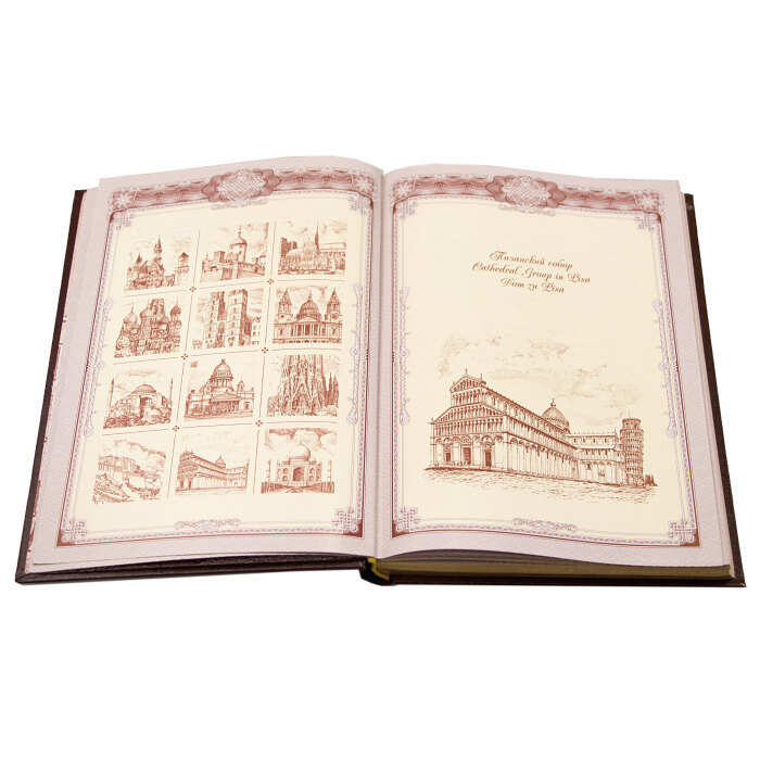 Оформление блока:сиз дизайнерской бумаги, с видами шедевров мировой архитектуры с описанием на русском, английском и немецком языках.