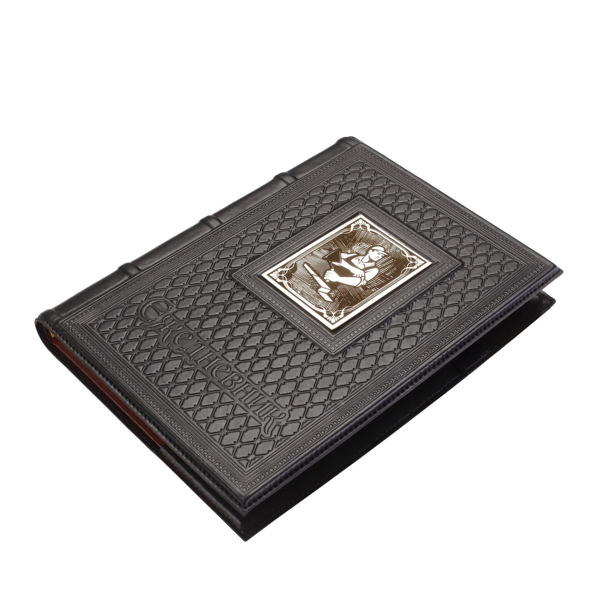 Оформление:кожаная оплетка по периметру изделия, латунная накладка, художественное тиснение.