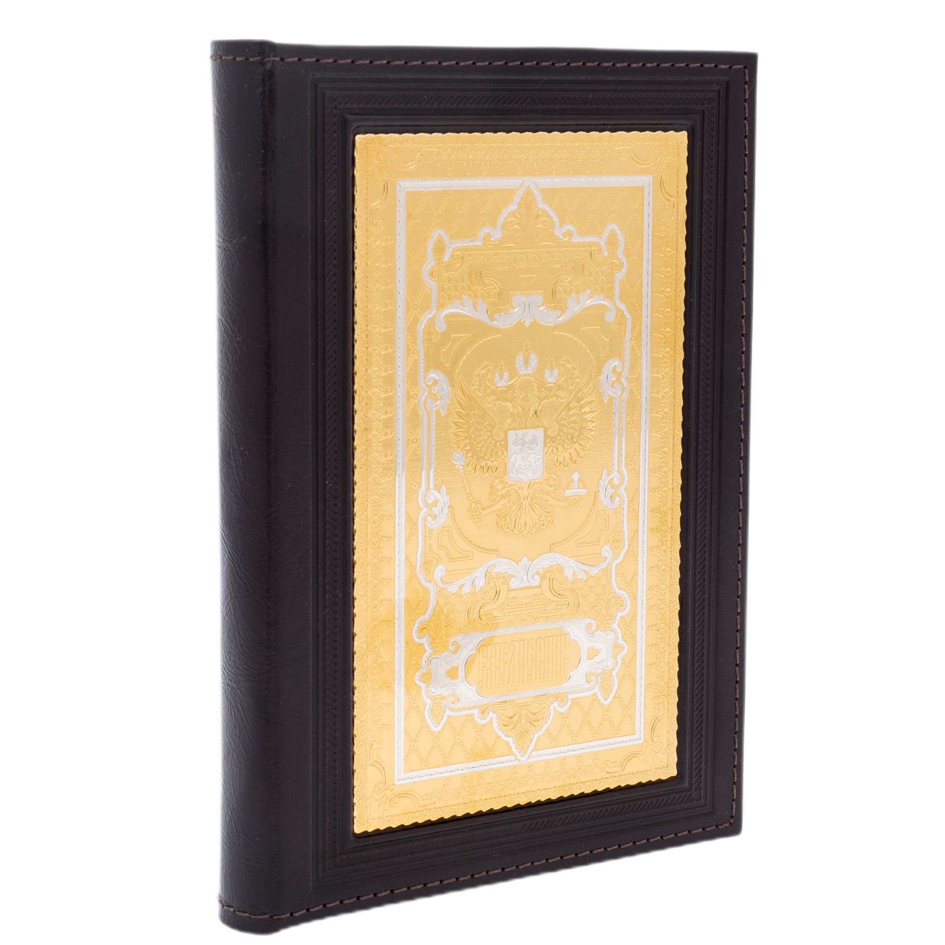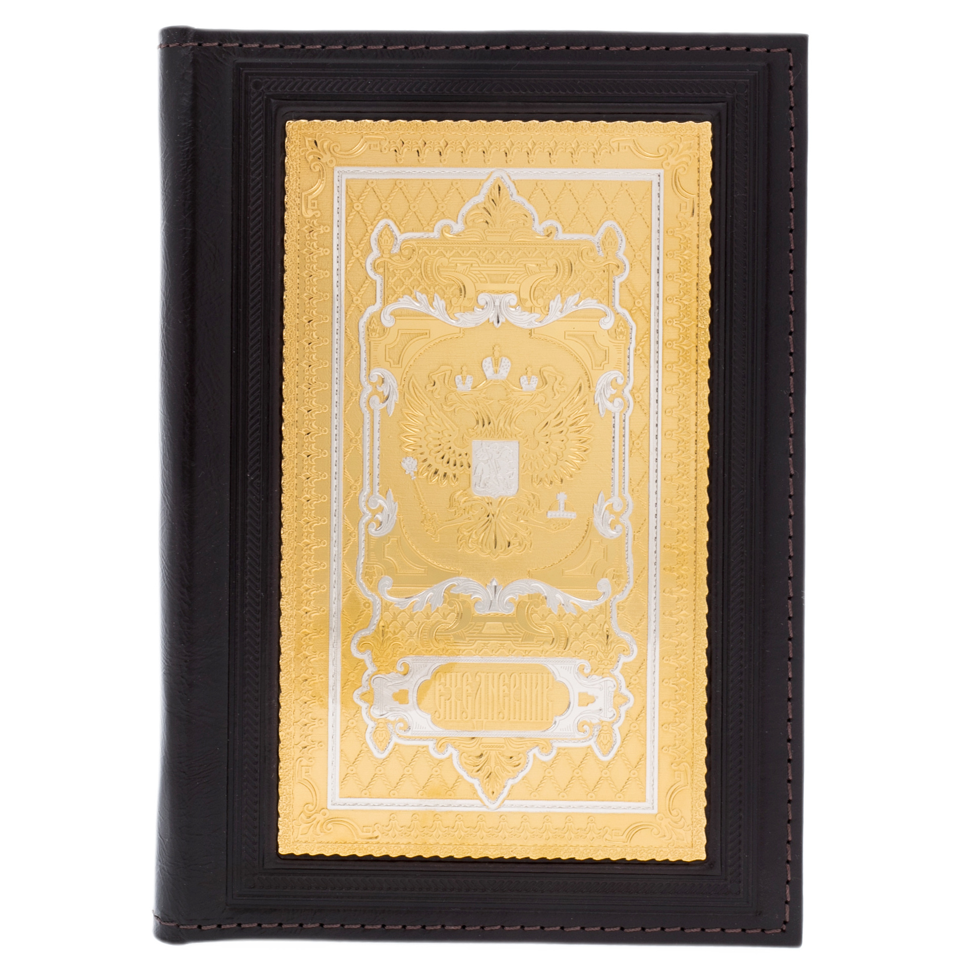 Ежедневник из натуральной кожи с массивной золочёной пластиной «Герб РФ» является статусным письменным атрибутом, созданным для тех, кто ценит безупречный порядок, утонченную эстетику и предметы с характером. Лицевая сторона украшена крупной ювелирной панелью, изготовленной в традициях златоустовского оружейного декора.