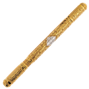 Художественная составляющая решена в традиции златоустовской школы: металл не просто декорирует, а работает как полноценная композиция, построенная на контрасте матовых и зеркальных плоскостей, тонких штрихов и мягких бликов позолоты. Орнамент читается рельефом, линии выглядят выверенными, словно выведенными под лупой, а свет на гранях играет по-разному при каждом повороте. На ручке мотивы продолжаются в миниатюре: гравированные завитки, чёткая разделка колец и аккуратные переходы покрытия создают впечатление ювелирной вещи, рассчитанной на ежедневное прикосновение и длительное использование. Визуальная дисциплина здесь важнее громких эффектов — спокойная роскошь раскрывается в качестве отделки и точности рисунка.