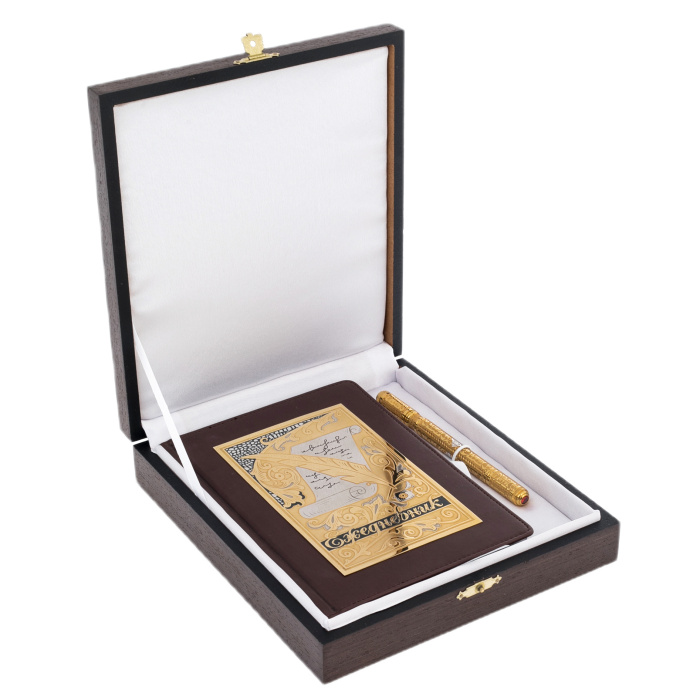 Образ "Статуса" строится вокруг смысла письма: перо, свиток, росчерк — символы власти мысли, ответственности за слово и привычки доводить начатое до подписи. Тёмная кожа задаёт фон, на этом фоне золото и серебро звучат уверенно, без лишней театральности, а красный камень на ручке добавляет единственный эмоциональный акцент, похожий на печать в конце документа. Ежедневник держит ритм дня, ручка поддерживает этот ритм уверенной линией, а художественная накладка напоминает о том, что решения имеют вес — и потому достойны быть записанными в вещь, выполненную с уважением к ремеслу и к владельцу.