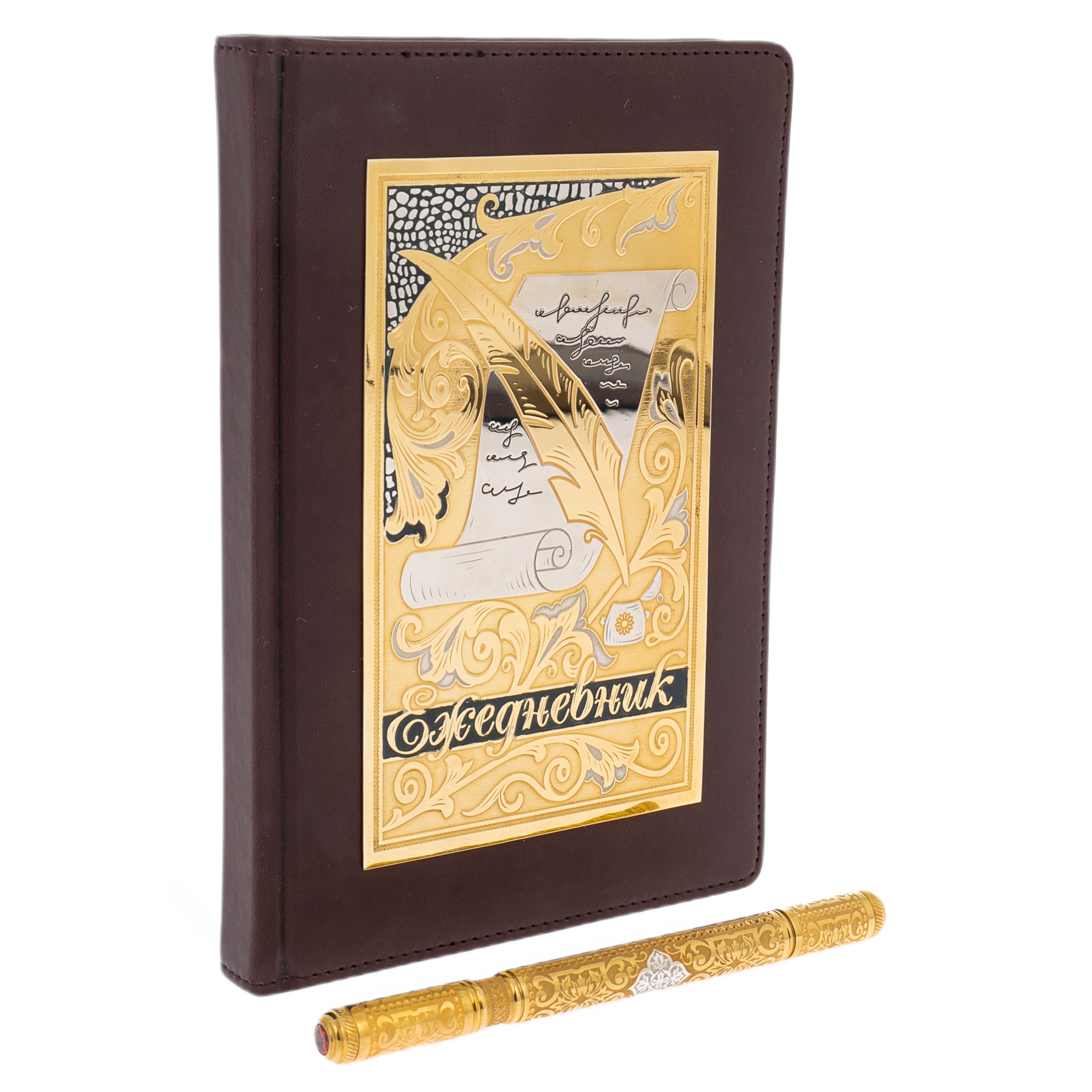 Ежедневник кожаный "Статус" с ручкой — представительский аксессуар для личного кабинета и деловых поездок, соединяющий практичность планирования с эстетикой подарка уровня коллекции. Плотная обложка, выполненная из гладкой тёмной кожи, держит форму и приятно ложится в ладонь, аккуратная строчка подчёркивает строгую геометрию торца. На лицевой стороне размещена декоративная металлическая накладка с многоуровневым рисунком: перо над свитком, росчерк рукописного текста, орнаментальные завитки и выделенная надпись "Ежедневник", задающая характер вещи. В комплект входит ручка в едином стиле — вытянутая, тяжёлая по ощущению, украшенная растительным узором и акцентом камня насыщенного красного тона на торце. Внутри — чистая, светлая бумага с разлиновкой, полями под дату и отметками дней недели, удобная для плотного графика и коротких пометок. Такой набор адресован руководителю, юристу, предпринимателю, человеку, привыкшему фиксировать решения не в заметках телефона, а на бумаге, оставляющей след.