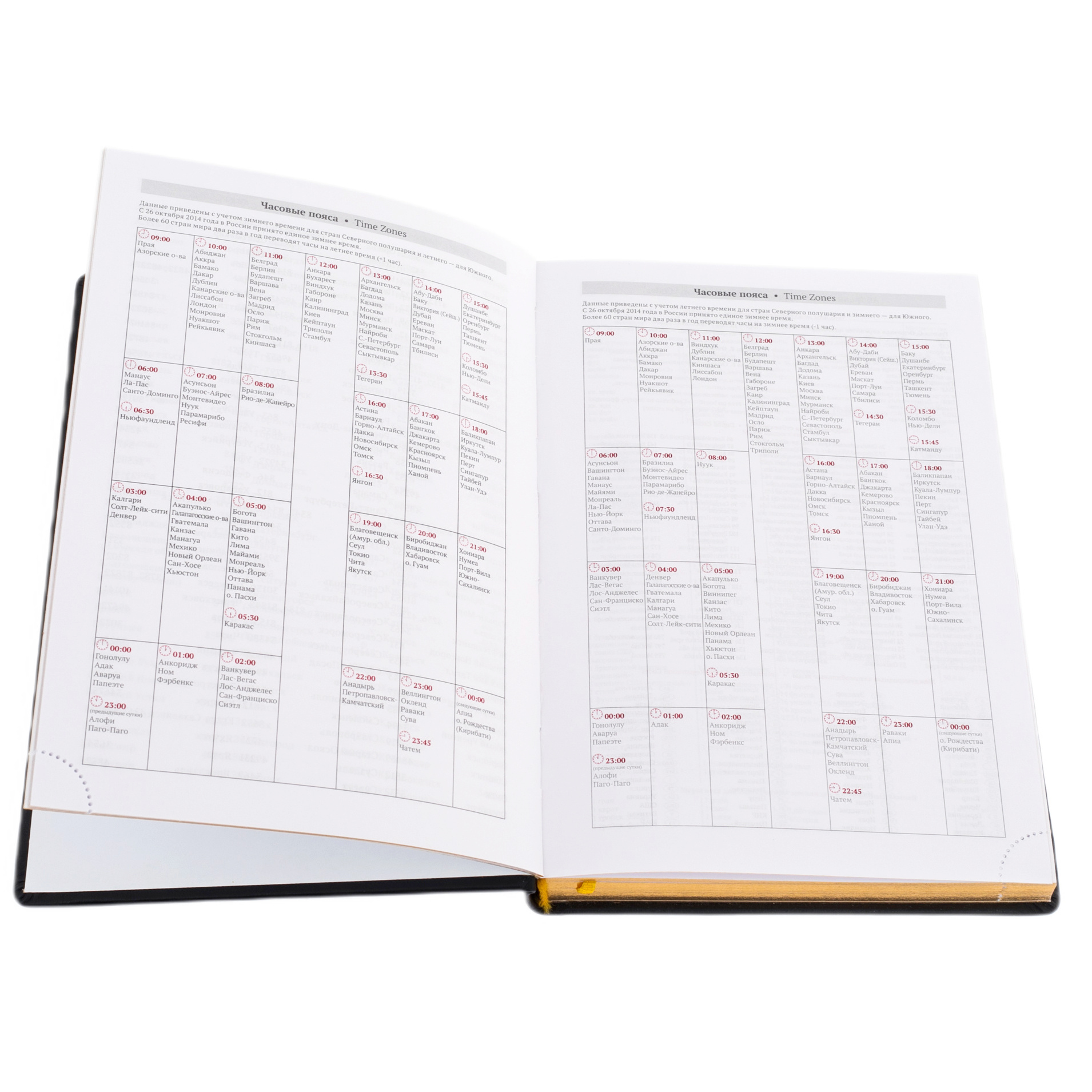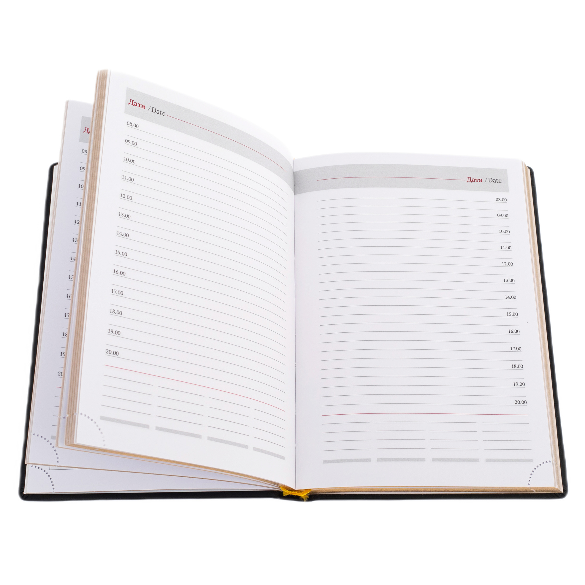 Каждая деталь изделия тщательно продумана. Внутри страницы выполнены с идеальной чёткостью и удобством для записей. Поля, выделенные для времени, создают структуру, помогающую максимально эффективно организовать день. Тонкая золотая закладка добавляет утончённый штрих, а каждая страница словно приглашает вписать туда планы, достойные великого замысла.