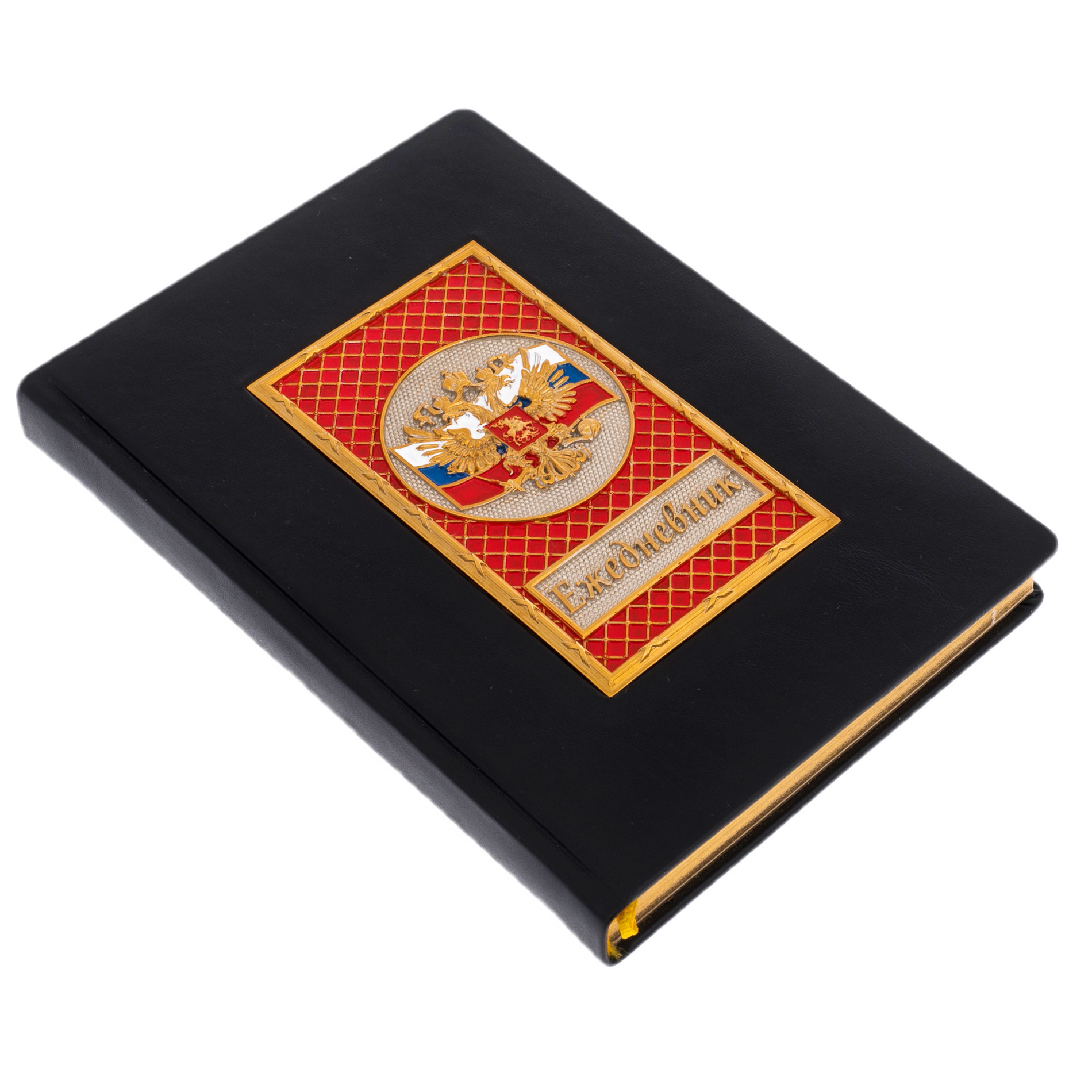 Этот ежедневник является не просто инструментом для планирования, а воплощением величия и утончённого вкуса. Его кожаная обложка символизирует стабильность и решительность, которыми должен обладать настоящий лидер. Центр композиции украшен гербом Российской Федерации, в обрамлении изысканного орнамента, напоминающего о торжественности и власти.