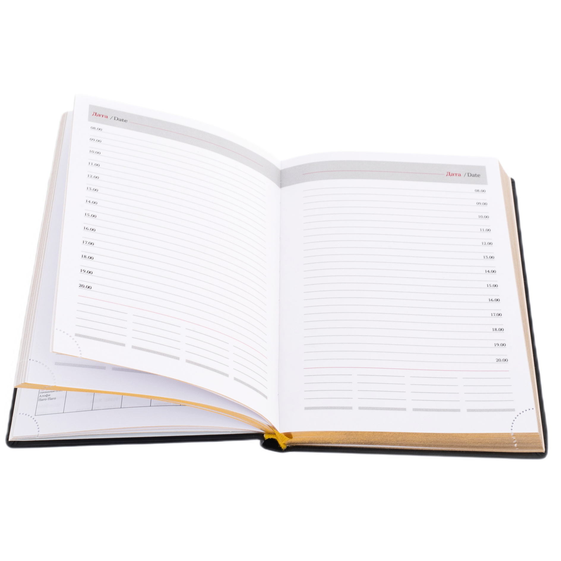 Каждая деталь изделия тщательно продумана. Внутри страницы выполнены с идеальной чёткостью и удобством для записей. Поля, выделенные для времени, создают структуру, помогающую максимально эффективно организовать день. Тонкая золотая закладка добавляет утончённый штрих, а каждая страница словно приглашает вписать туда планы, достойные великого замысла.