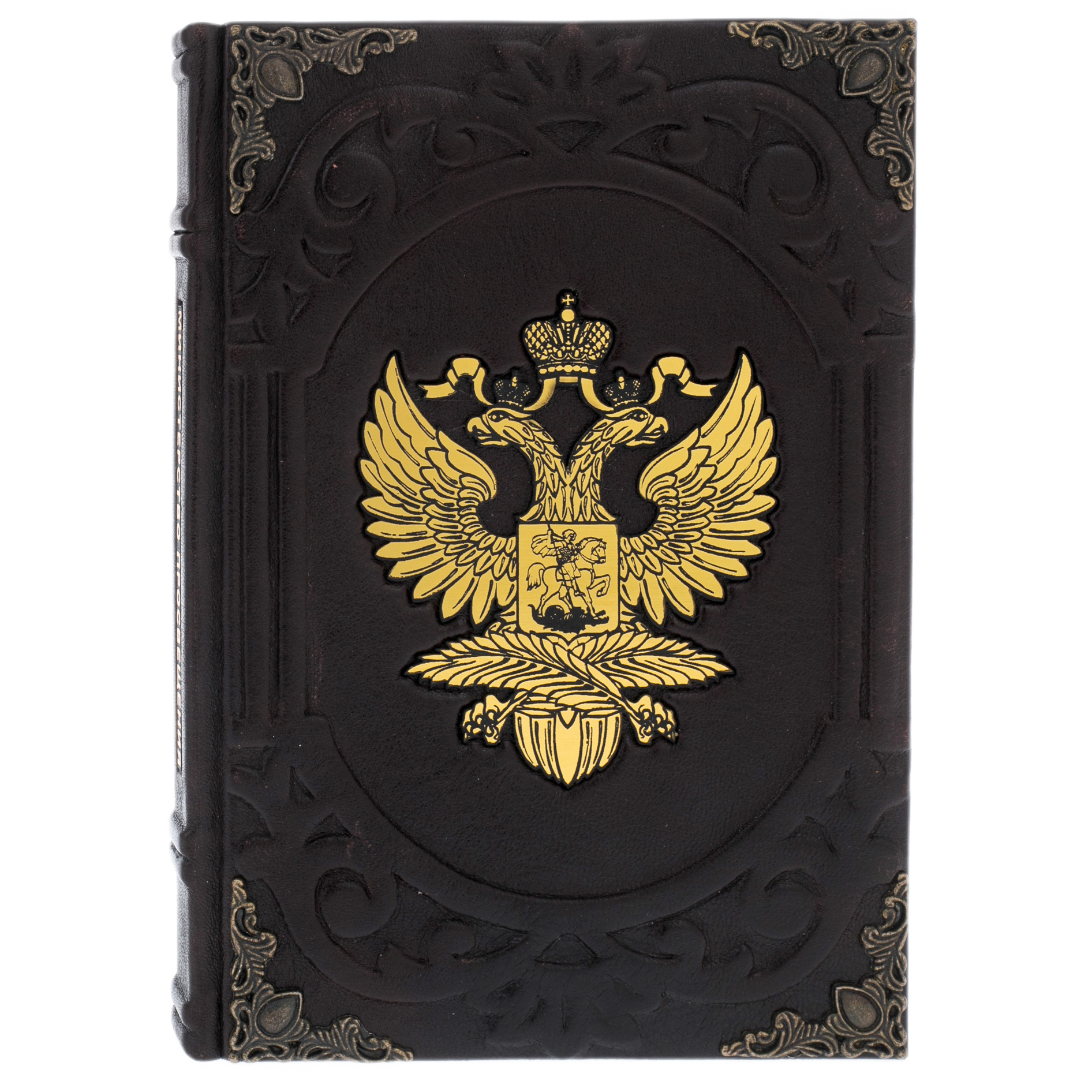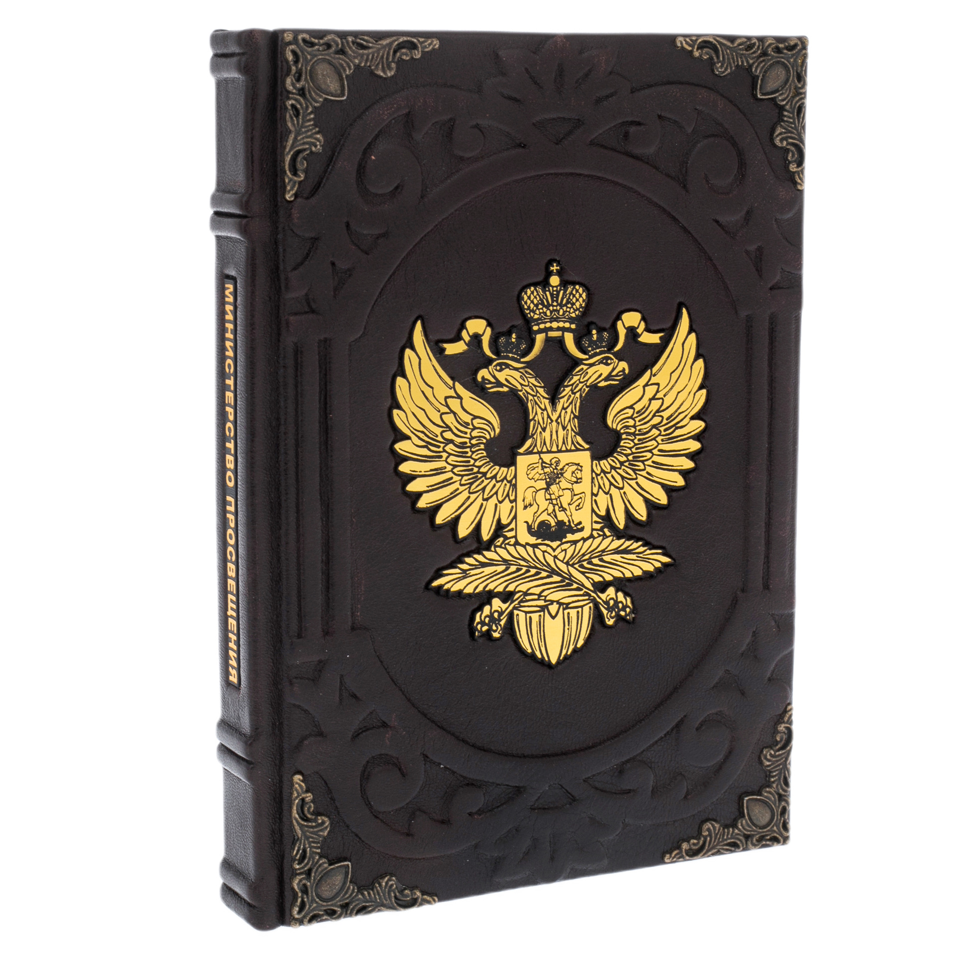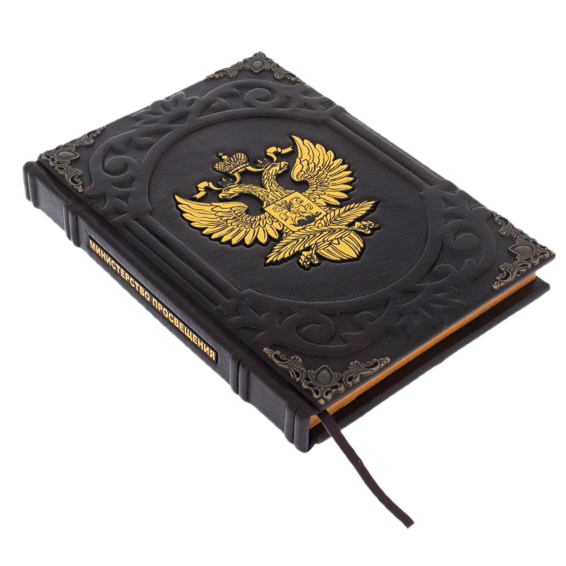 Ежедневник «Министерство просвещения» — это не просто предмет делопроизводства, а артефакт высокого административного достоинства, созданный для тех, чьё слово оформляет судьбы. Обложка из тёмной кожи, украшенная рельефным тиснением и позолоченным двуглавым орлом с гербом, вызывает ассоциации с официальными государственными печатями и секретными делами особой важности. Тонкие угловые завитки в верхней и нижней части переплёта придают изделию сдержанную декоративность, не нарушающую общего чувства монументальной сдержанности. На корешке, оформленном золотыми буквами, читается надпись «Министерство просвещения» — лаконично и весомо.