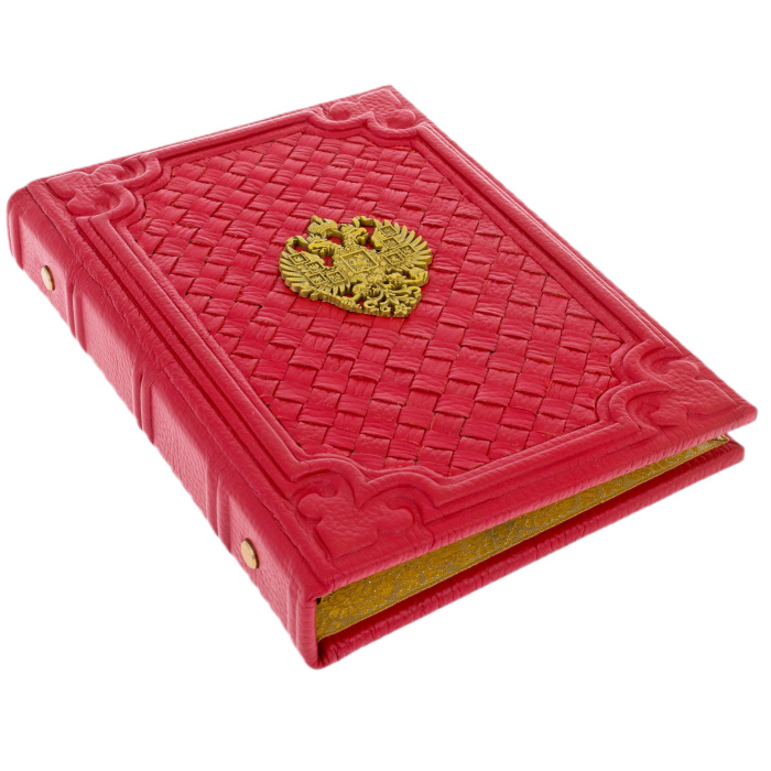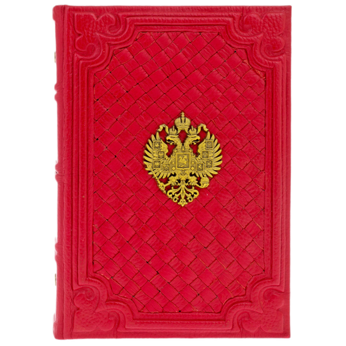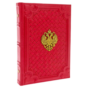 Ежедневник в кожаном переплёте "Российская империя" — предмет, где соединяются традиции государственной символики и эстетика высокого ремесла. Массивная обложка из натуральной кожи, окрашенной в глубокий оттенок императорского алого, оформлена тиснёным плетёным узором и обрамлена рельефными угловыми элементами. В центре композиции выделяется позолоченный герб Российской империи — двуглавый орёл, символ власти, преемственности и достоинства. Его рельеф исполнен с ювелирной точностью: каждая деталь крыльев, щитов и корон прочитывается в свете как тонкая скульптура.