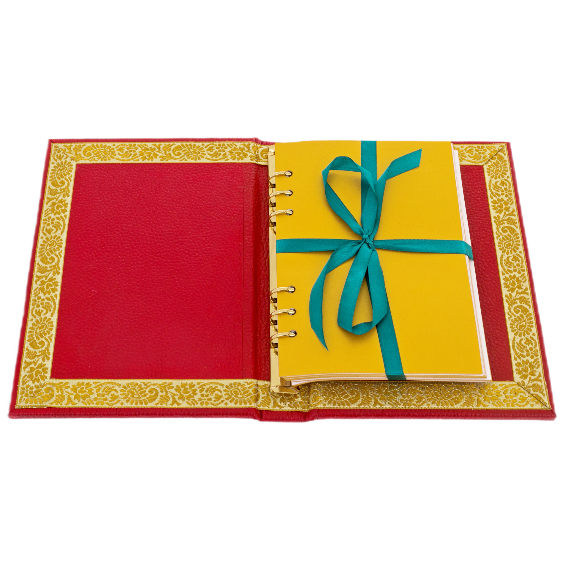 Внутреннее оформление выдержано в торжественно-классическом стиле. Плотные страницы крепятся на металлический механизм, позволяющий менять блоки и сохранять переплёт как долговечную основу. Внутренний кант с золотым тиснением украшает разворот, создавая ощущение драгоценного переплётного убранства старинных архивов. Цветовая композиция — красный, золотой и бирюзовый акцент ленточного банта — построена по законам парадного ансамбля: каждая деталь уравновешена, каждый оттенок подчинён идее величия и порядка.