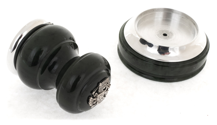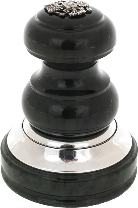 Гербовая печать из черного нефрита представляет собой изысканный аксессуар, символизирующий власть и авторитет. Рукоять печати выполнена из редкого черного нефрита, а матрица изготовлена из высококачественного металла, обеспечивающего чёткость оттиска. Гравировка в виде государственного герба России подчёркивает патриотизм и уважение к национальным символам.