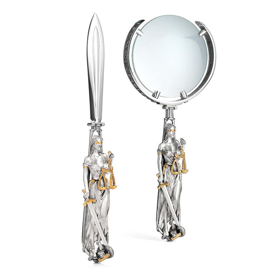 Настольный набор для юриста состоит из ножа для разрезания писем и увеличительного стекла. Фирменный подарочный футляр в комплекте.