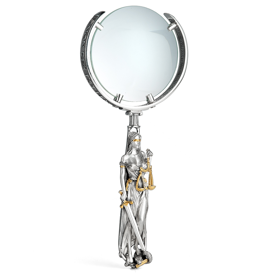 Ручка лупы украшена детально проработанной статуей Фемиды — в древнегреческой мифологии богини правосудия. Греки почитали её как блюстительницу порядка, нравственных основ и всего общественного строя. В правой руке Фемида держит весы. Это символ меры и справедливости. На весах правосудия взвешиваются добро и зло, вина и невиновность. В левой руке богиня держит обоюдоострый опущенный меч (римляне заменили на изначальный рог изобилия) — символ готовности к возмездию. На глазах Фемиды повязка (скульпторы стали использовать этот образ только в Средние века). В данном случае, это символ беспристрастности: судья не взирает на самих тяжущихся, на их имущественное и социальное различие, а лишь внемлет фактам и правде, выслушивая обе стороны. Одной ногой Фемида наступает на голову змеи (символу не только мудрости и могущества, но и искушения), лежащей на книге — своде законов. Римляне заимствовали красивый и сложный образ Фемиды у греков в виде Юстиции.